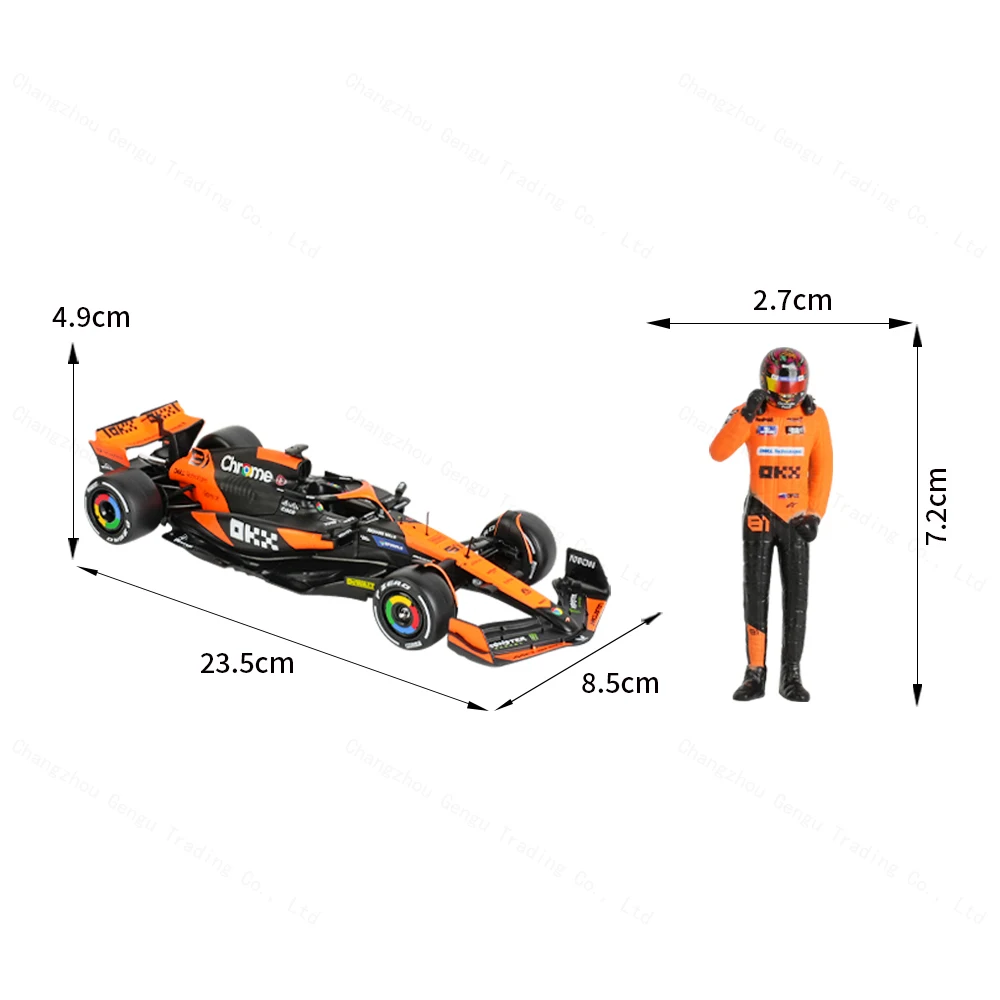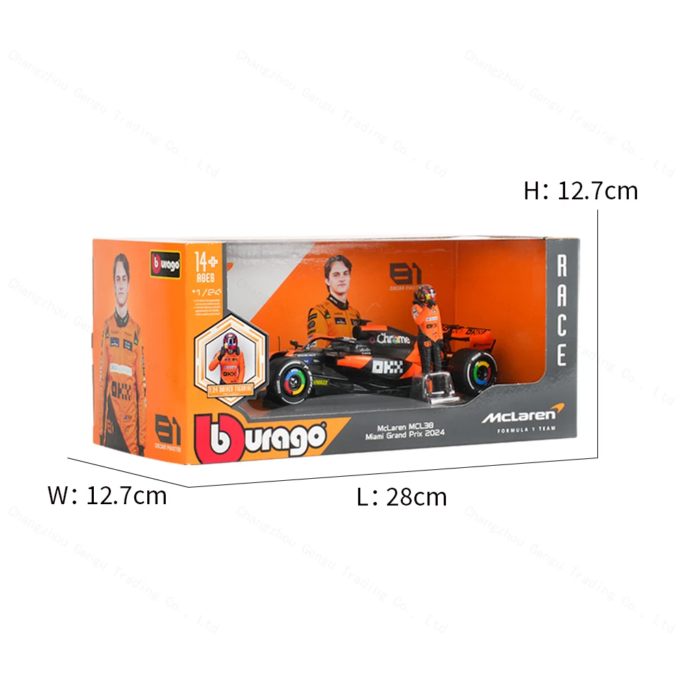 Experience the thrill of Formula 1 with this highly detailed 1:24 scale die-cast model of the McLaren MCL38 from the 2024 Miami Grand Prix. Measuring approximately 23.5 cm long, 8.5 cm wide, and 4.9 cm high, it captures every aerodynamic detail with precision. The sleek black body is accentuated by vibrant orange highlights on accents like the front wing, sidepods, and rear wing, giving it an energetic and modern racing aesthetic. The wheels feature realistic decals and are capable of free rotation, enhancing display interactivity. This high-fidelity replica is crafted from die-cast metal with high-quality plastic components, making it durable and true to the racing machine it represents. An excellent addition for any collector or racing enthusiast.