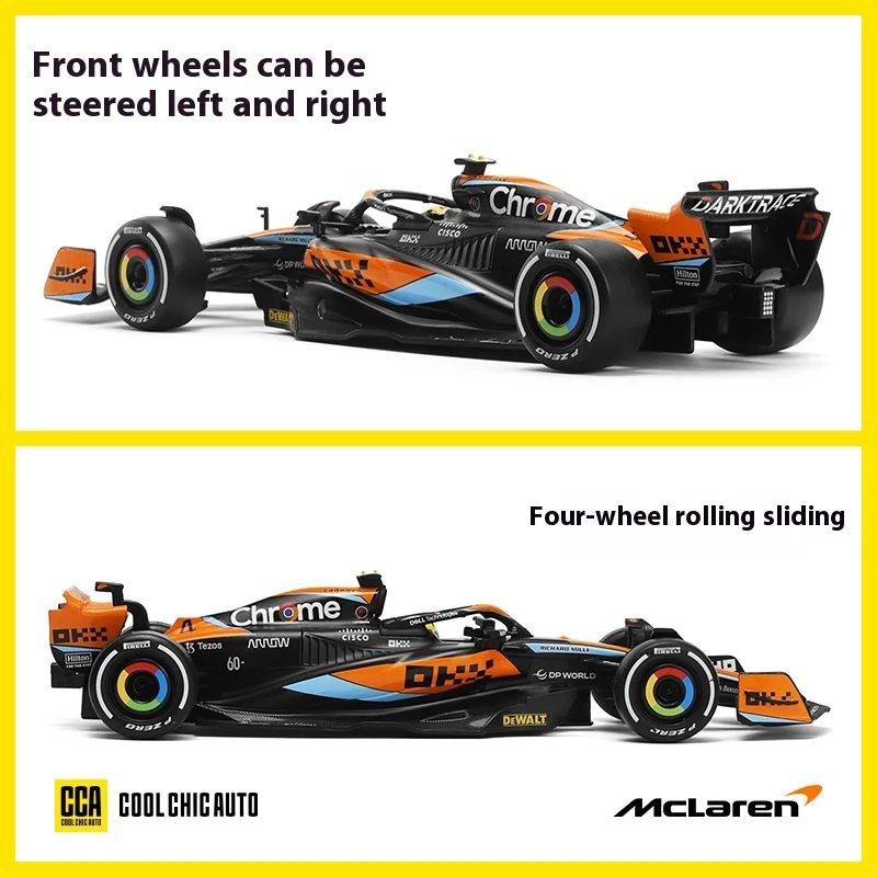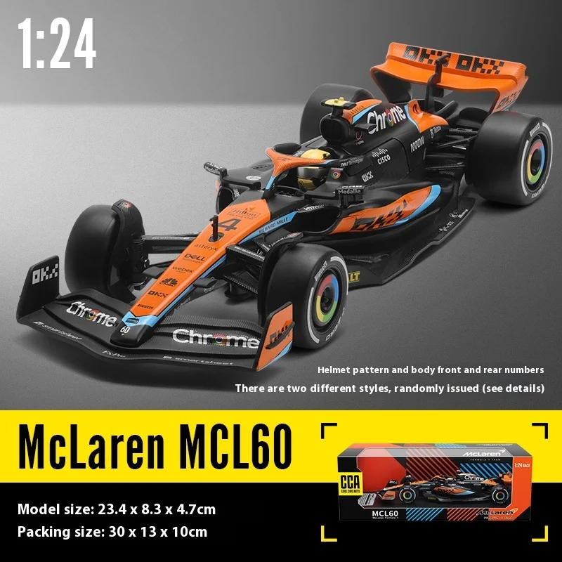 Experience the thrill of Formula 1 with this highly detailed 1:24 scale diecast model of the McLaren MCL60 from the 2023 season. Made of durable metal, this collectible replica features an aerodynamic bright orange body accented with sleek black details, intricate front and rear wings, streamlined sidepods, and realistic wide slick tires with textured treads. Its glossy finish enhances its high-quality, shiny appearance. Suitable for enthusiasts aged 14 and above, it makes an impressive display piece or thoughtful gift, capturing the dynamic style and precision engineering of modern F1 racing in a stunning miniature scale.
