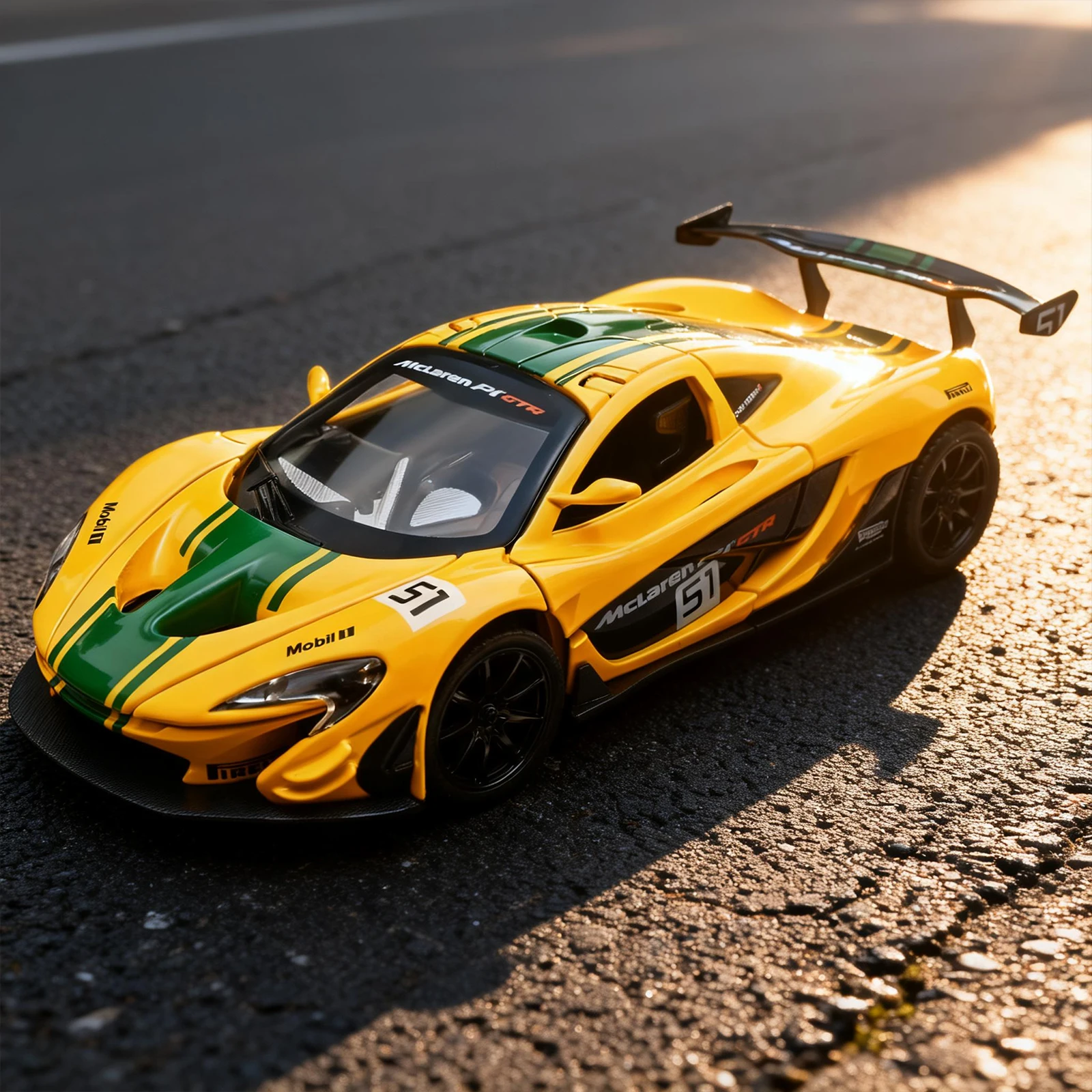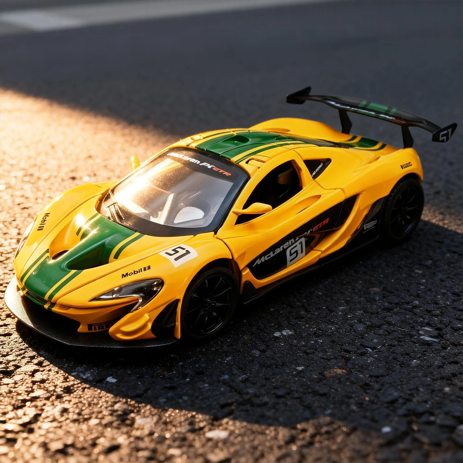 - The bright yellow body with vivid green racing stripes emphasizes speed, sportiness, and aerodynamic excellence, authentic to the original McLaren P1-GTR design.