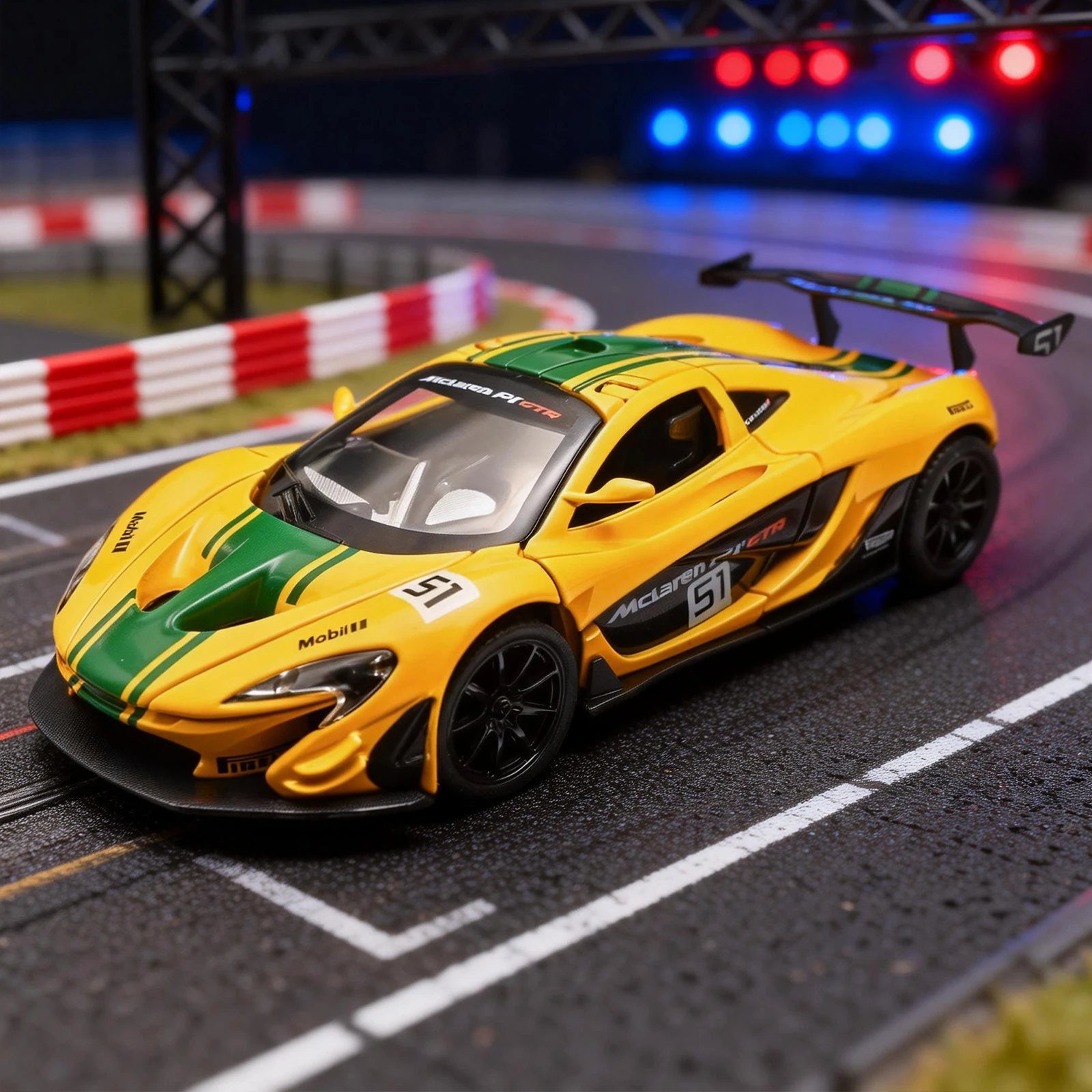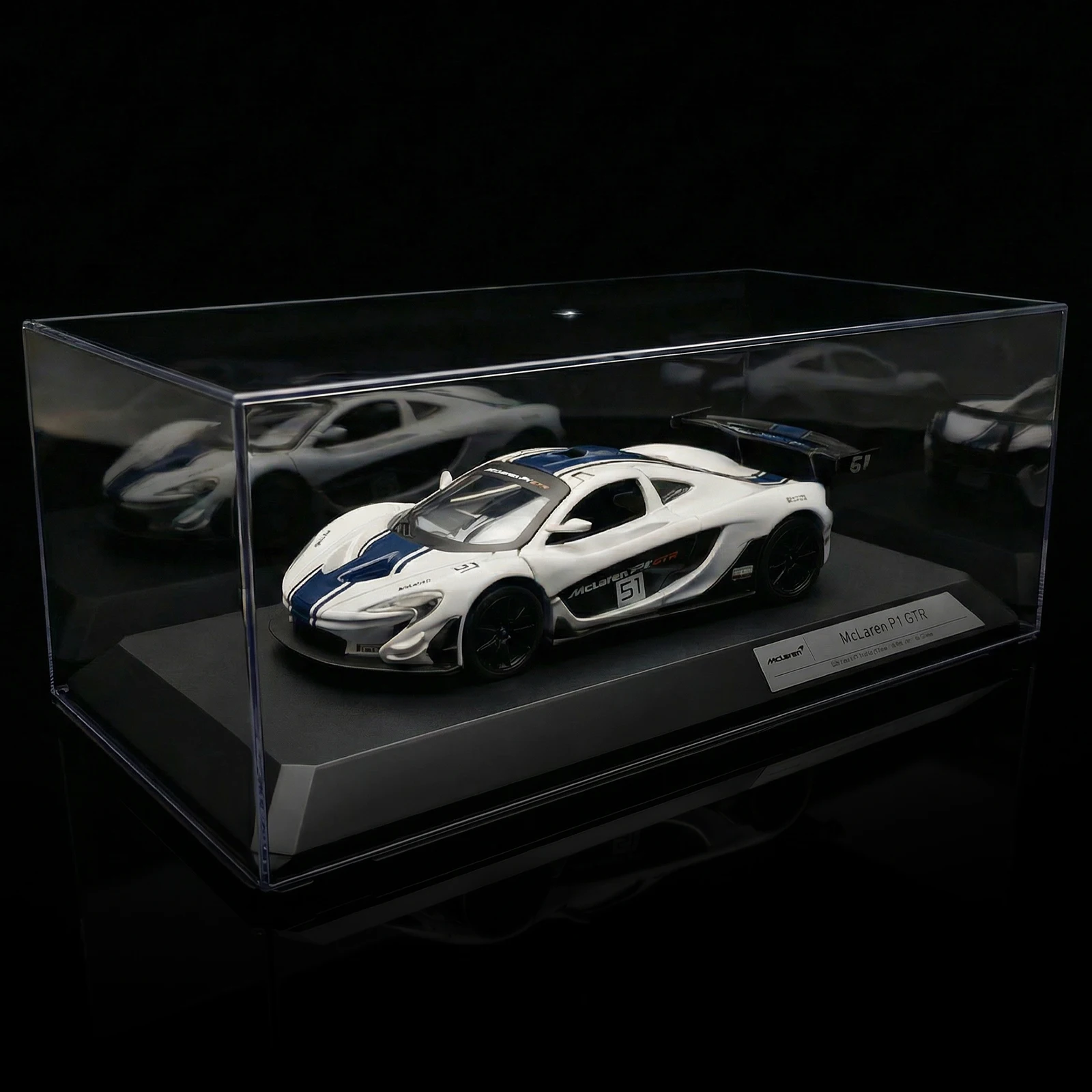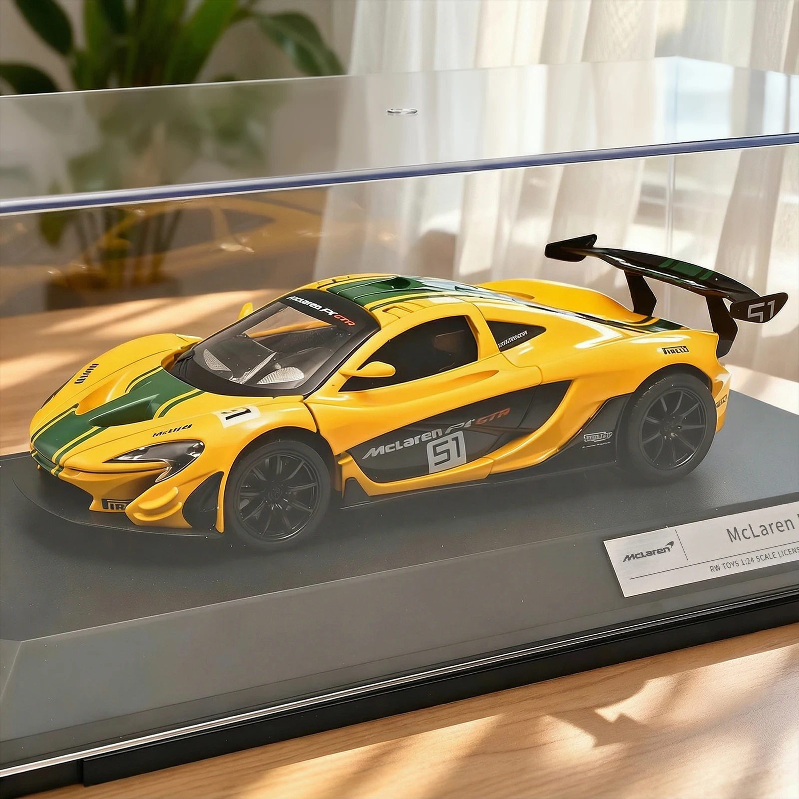 - Features realistic details such as sharply contoured hood, aerodynamic side mirrors, decals with “McLaren P1-GTR” branding, and racing number “51.”