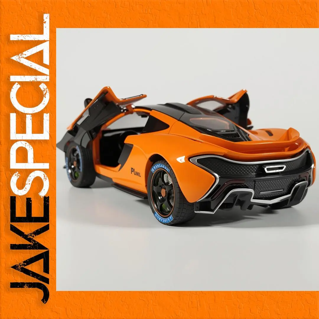 The 1:24 scale McLaren P1 GTR Supercar diecast model is crafted from metal and designed for high simulation decoration, display, or as a collector’s item. Featuring a striking orange body with glossy finishes and sleek black accents, this model showcases an aggressive stance with intricately detailed headlights and a finely textured grille. The signature butterfly doors open to reveal an elegant black and orange interior. The realistic wheels come in black with silver trim, fitted with rubber tires marked “Kansango.” Completing the model are a pronounced rear wing and intricately painted tail lights, authentically representing the original vehicle’s essence.