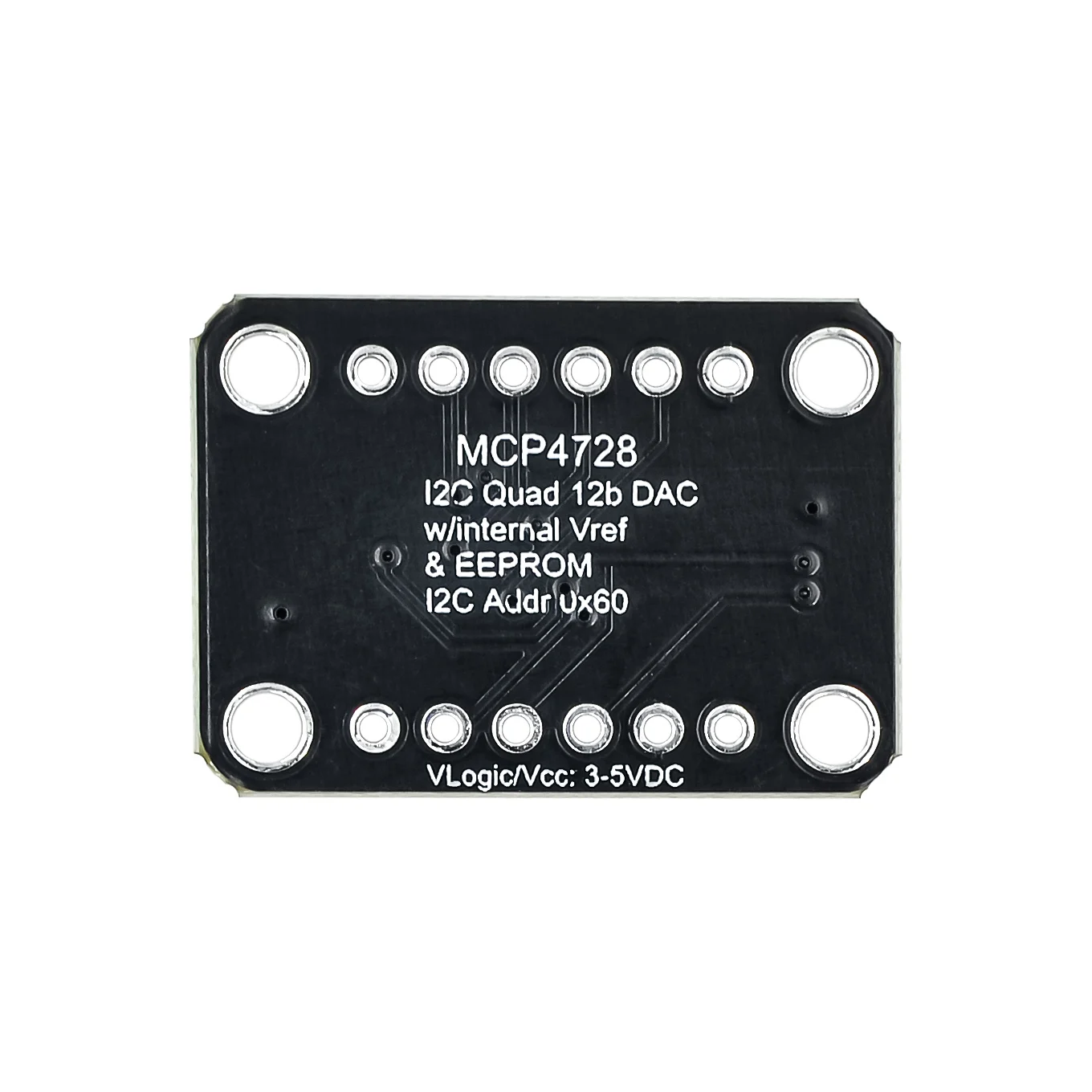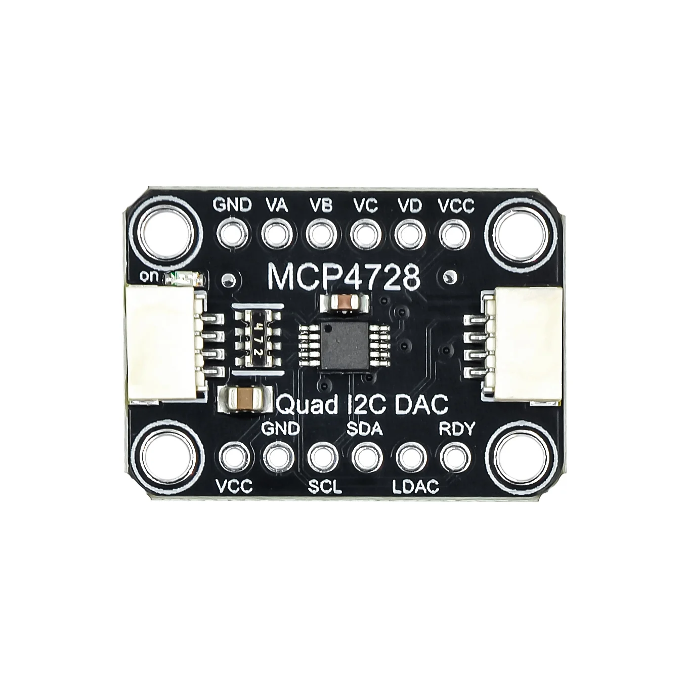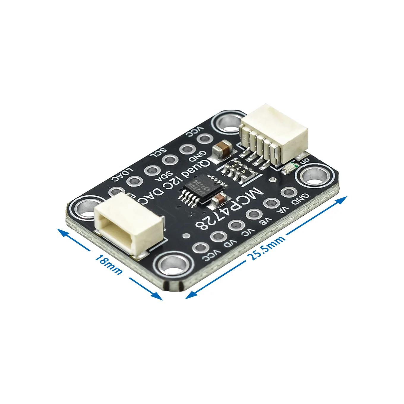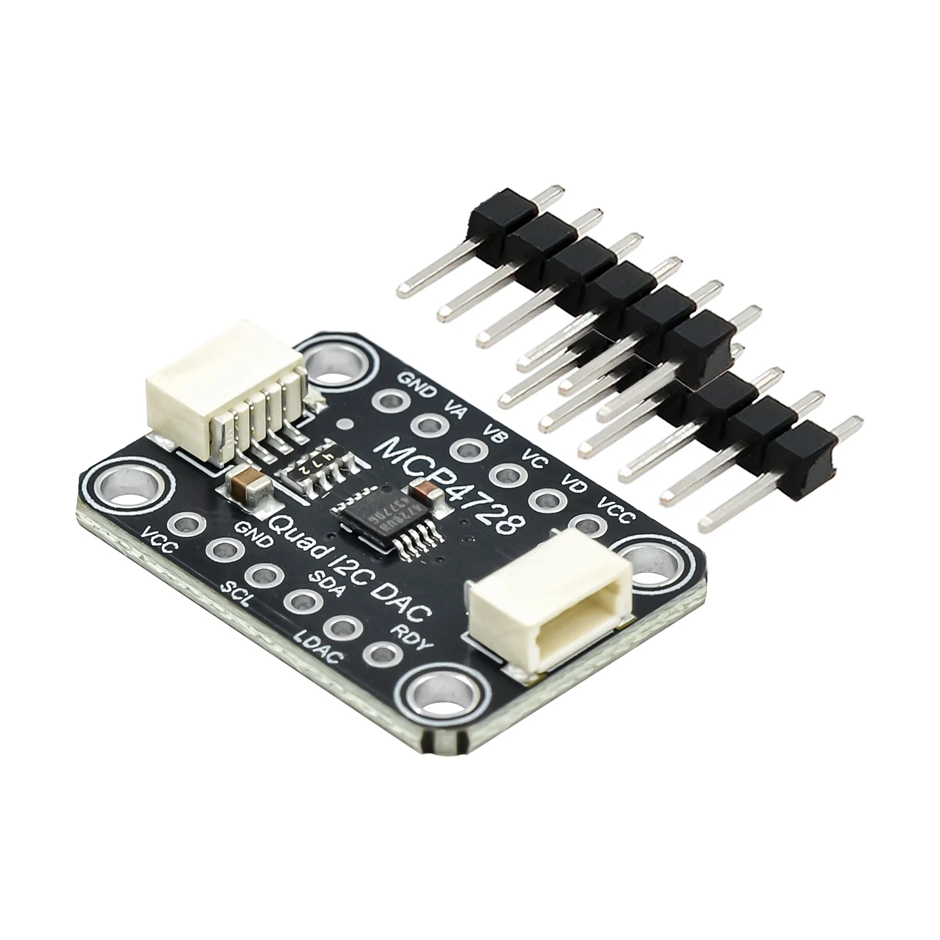 Experience precise voltage control with this sleek MCP4728 Quad DAC module. Crafted with a compact black PCB featuring rounded corners, its minimalist design combines functionality and style seamlessly. The four high-resolution 12-bit DAC channels provide accurate analog output voltage, ranging from 0V to 2.048V or 4.096V depending on configuration, making it perfect for detailed analog signal applications. The onboard EEPROM ensures your settings are saved and automatically loaded, streamlining your workflow. Designed for easy integration, the module includes clearly labeled components, a white rectangular connector for I2C communication, and versatile mounting options. Enhance your projects with this modern, reliable module that combines technical excellence with a clean aesthetic.