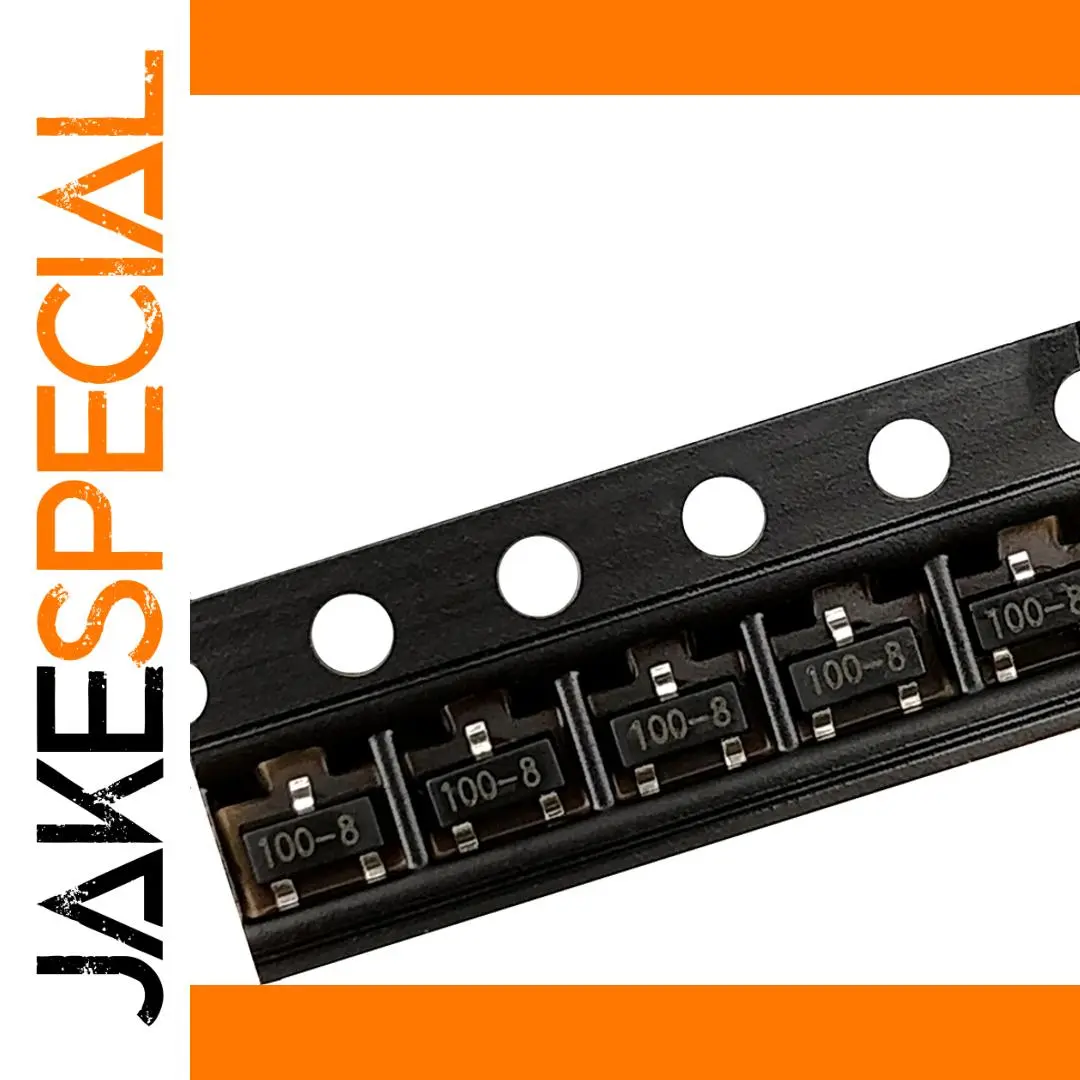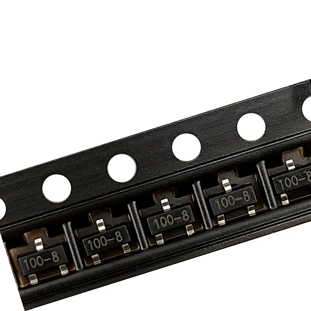 Enhance your electronic projects with this pack of 100 new MCR100-8 SCR rectifiers in SOT-23 surface-mount packages. These silicon-controlled rectifiers feature a sleek, black rectangular body with a matte finish, contrasting shiny metallic leads on each side, and crisp white markings reading “100-8” for easy identification. Designed as triode transistors, they are suitable for use as leakage protectors and specialized rectifiers in automated assembly and circuit applications. Ideal for professionals seeking reliable, high-quality components, these SCRs are perfectly arranged along a flexible carrier tape with evenly spaced holes for precise pick-and-place installation. A trusted choice for durable and efficient electronic performance.