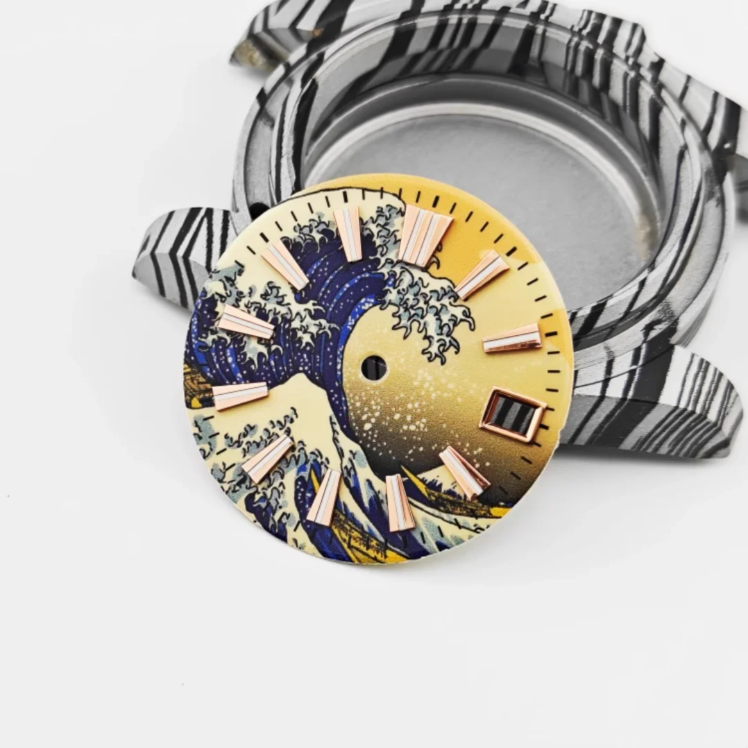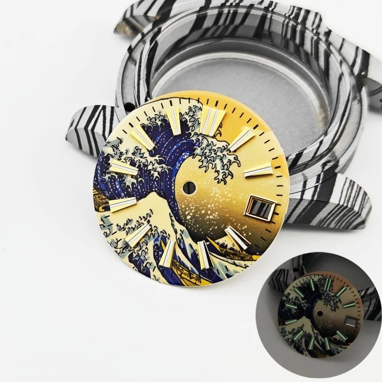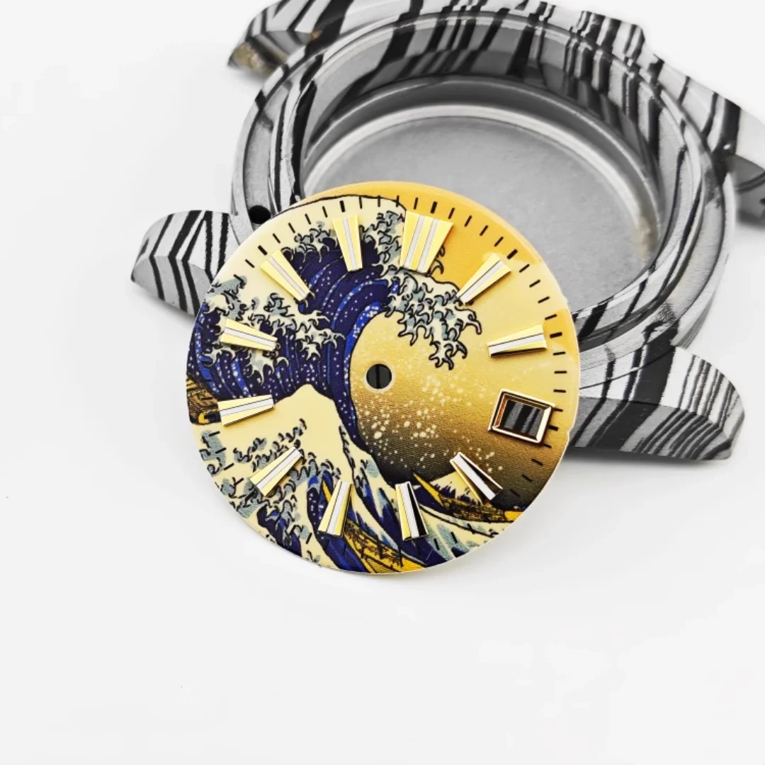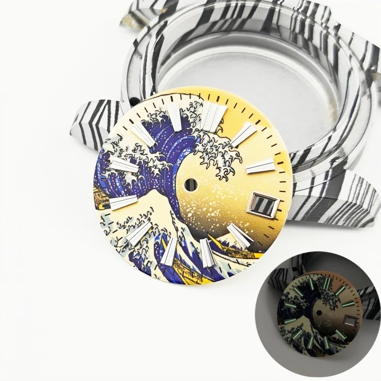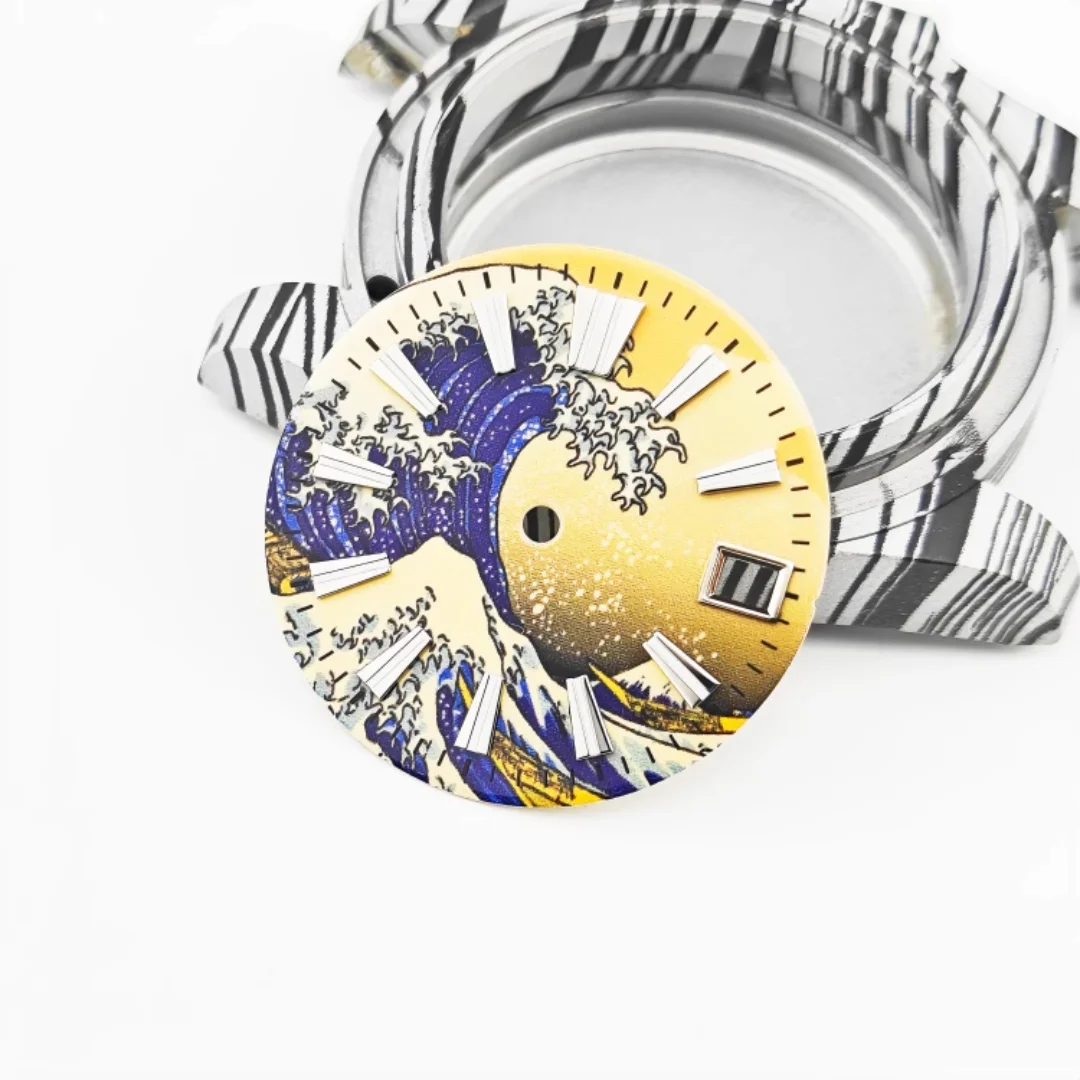 Imagine elevating your watch collection with this stunning MDNEN 28.5mm enamel watch dial featuring a vibrant yellow wave surface inspired by traditional Japanese art. The captivating design depicts a large, dynamic wave in deep blue and white shades, accented with foam and spray details that evoke energy and power. The background transitions from a golden-yellow hue at the top to darker shades at the bottom, creating a beautiful sunrise or sunset scene. The dial's raised, three-dimensional log scales in luminous C3 green add both style and functionality, ensuring readability in low light. Crafted with quality stainless steel, this dial seamlessly combines artistic elegance with precise craftsmanship, perfect for customizing a modern, stylish timepiece.