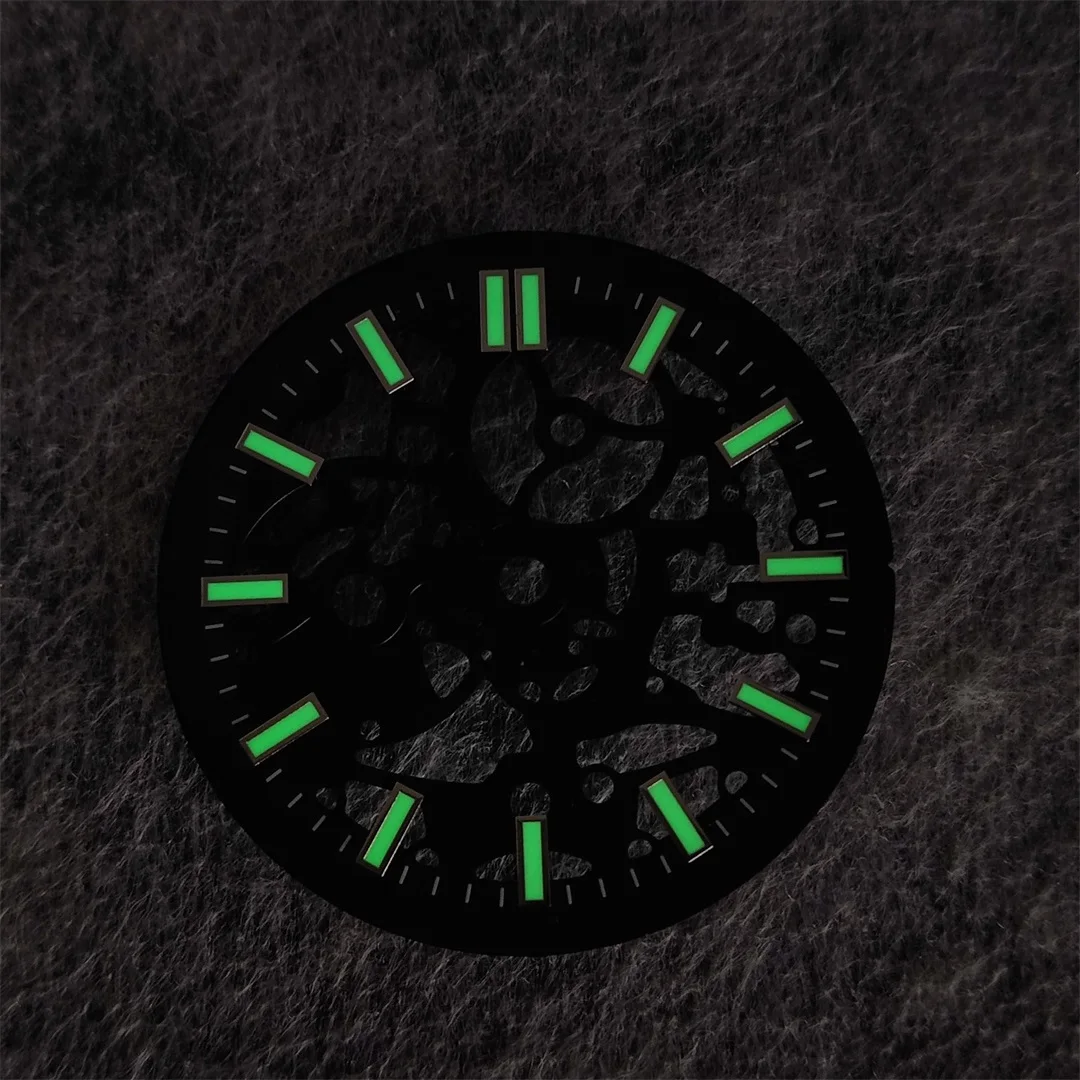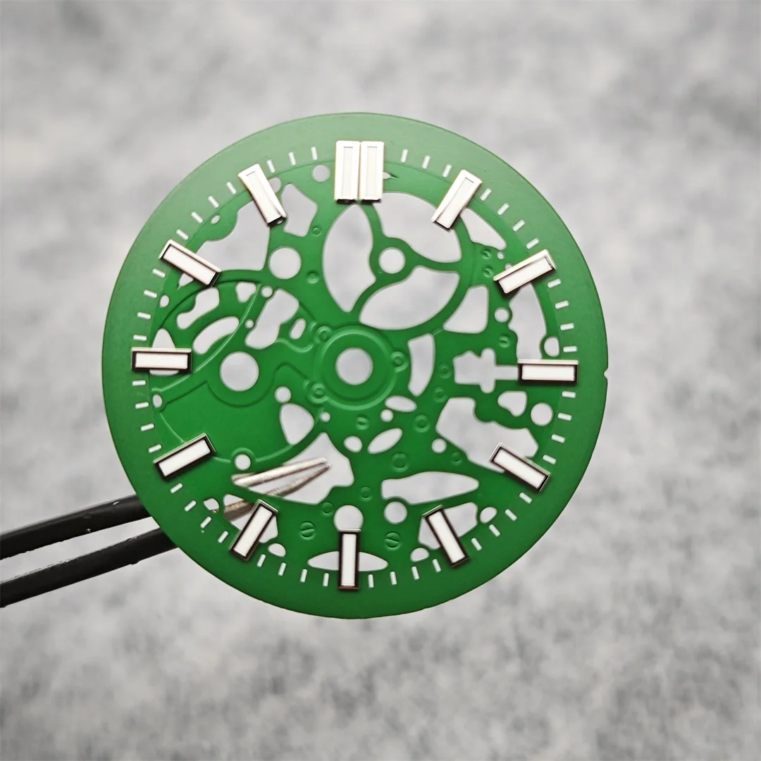 Enhance your watch collection with this 29.8mm round, hollowed-out stainless steel dial featuring a vivid green luminous display and matching luminescent hands. Compatible with NH70 and NH38 automatic self-wind movements, this sleek, numeral-free dial adds a modern, unisex touch to casual and fashion-forward timepieces. Available in multiple colors including black, blue, light blue, and white, it offers versatile style options. Crafted from durable stainless steel, it provides a polished finish and a sophisticated look. Perfect for customizing your watch or creating a unique style statement, this dial combines technical precision with contemporary design for an effortlessly stylish accessory.