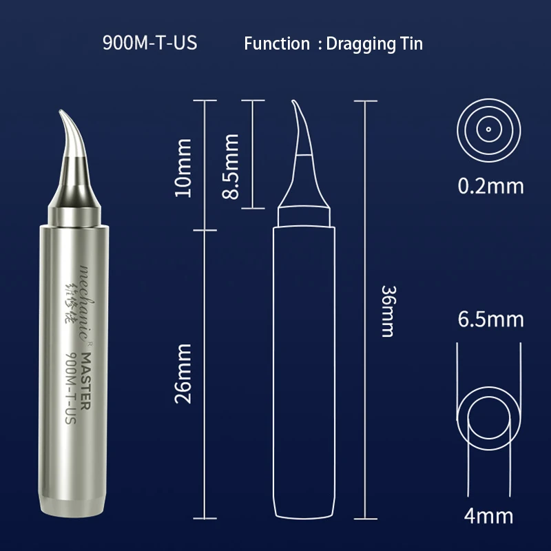 Immerse yourself in professional-grade craftsmanship with the this MECHANIC 900M-T lead-free soldering iron tip. Designed for intricate motherboard repairs, it features a compact, short blade profile that ensures precision with every application. The highly polished, metallic finish reflects durability and high-quality electroplating, making it resistant to oxidation and corrosion. Its fast heating time of just 0.5 seconds and heat conduction reduction to 3.5 seconds allow for swift, efficient work. This tip seamlessly combines ergonomic comfort—encouraging a 30° tilt during use—with technical excellence for disassembly welding, drag tin, glue removal, pad cleaning, and back welding. Crafted for demanding electronic repairs, it elevates your tools to a new level of reliability and precision.
