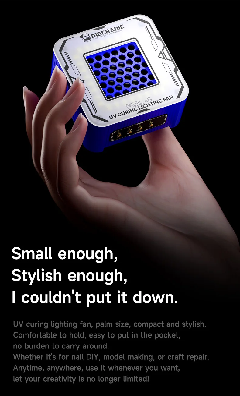 Experience the ultimate in precision and convenience with this multifunctional MECHANIC FUL-4 UV Curing Lighting Fan. Compact yet powerful, its vibrant blue rectangular body features a sleek, textured surface complemented by perforated ventilation panels, exuding a modern industrial aesthetic. The adjustable black arm with multiple joints allows effortless positioning up to 180 degrees, ensuring optimal workspace alignment. Its integrated LED offers a bright, flicker-free illumination, perfect for detailed soldering, UV glue curing, and smoke extraction. Lightweight and portable, this device comfortably fits in your hand, making it ideal for mobile repair tasks or DIY projects at home or in the workshop. Its versatile design turns complex tasks into seamless experiences.