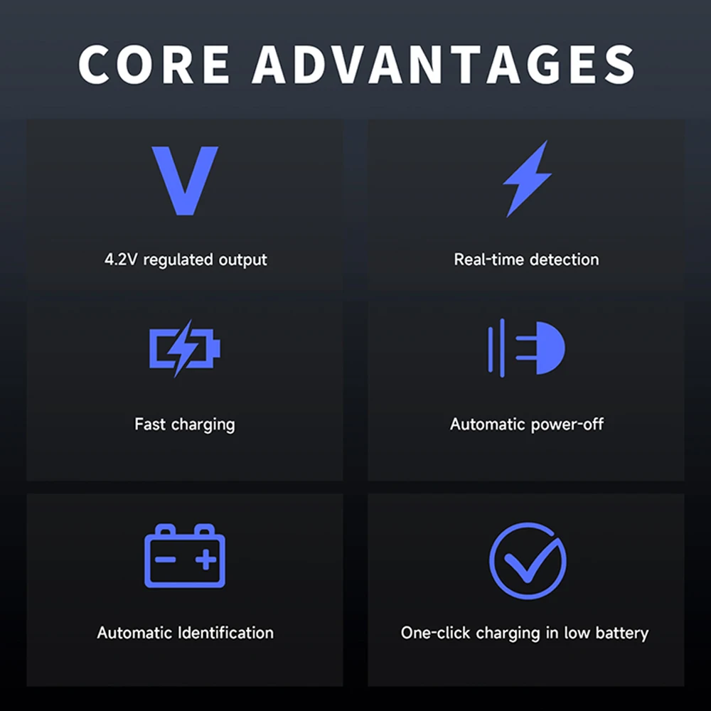 - Operates within an adaptive voltage range of 4.2V to 4.5V, allowing precise regulation for safe and effective battery activation and rejuvenation processes.