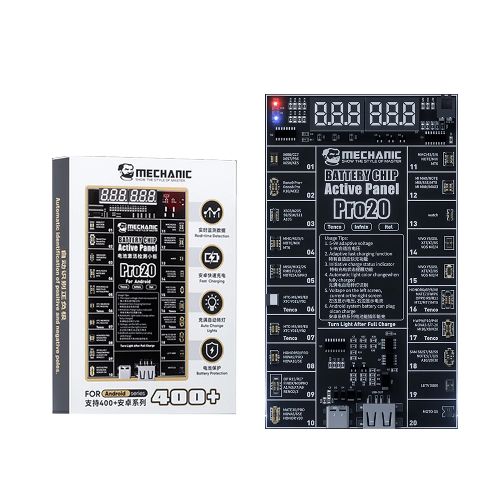 Experience precise battery testing with this sleek, professional-looking MECHANIC Pro20 Battery Activation Test Board designed for Android mobile repairs. Its compact size of 134mm by 77mm and lightweight of only 49 grams make it easy to handle during repairs. The matte black finish combined with organized, small components reflects durability and high precision, perfect for skilled technicians and DIY enthusiasts alike. The standout feature is the bright LED digital display that clearly shows voltage, current, and charging status. With a thoughtful layout of connectors, ports, and anti-slip features, this device ensures safe, reliable, and efficient battery activation, compatible with over 400 Android models including Huawei, Samsung, Xiaomi, and VIVO. It’s a smart choice for quick repairs and battery rejuvenation.