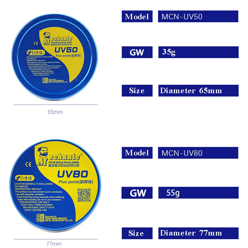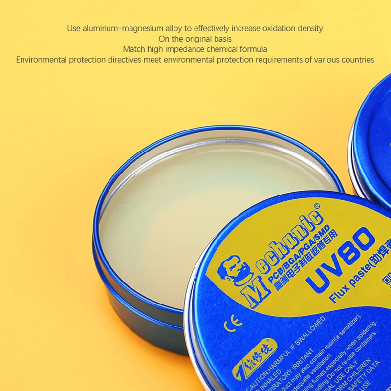Experience professional-grade soldering with this lead-free, no-clean electric soldering flux paste, available in two models: MCN-UV50 (40g) and MCN-UV80 (55g). Featuring a particle size of 1-10μm, these fluxes are ideal for precise PCB, BGA, PGA, and SMD soldering applications, making them perfect for electronics and smartphone repairs. Crafted for high-quality, reliable results, the flux is RoHS compliant, ensuring safety and environmental standards are met. Its smooth, creamy consistency ensures ease of application and excellent flow during soldering, helping you achieve clean, efficient joints with confidence.