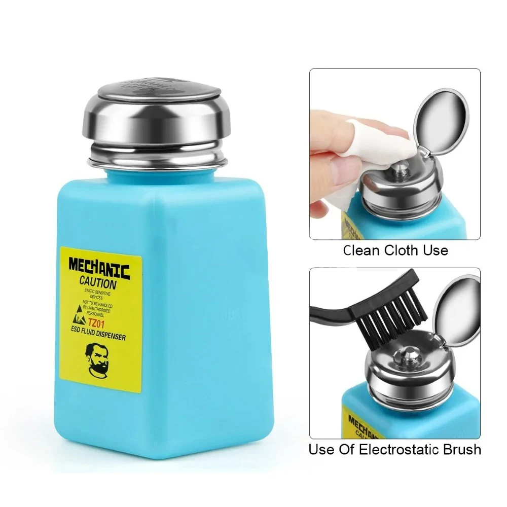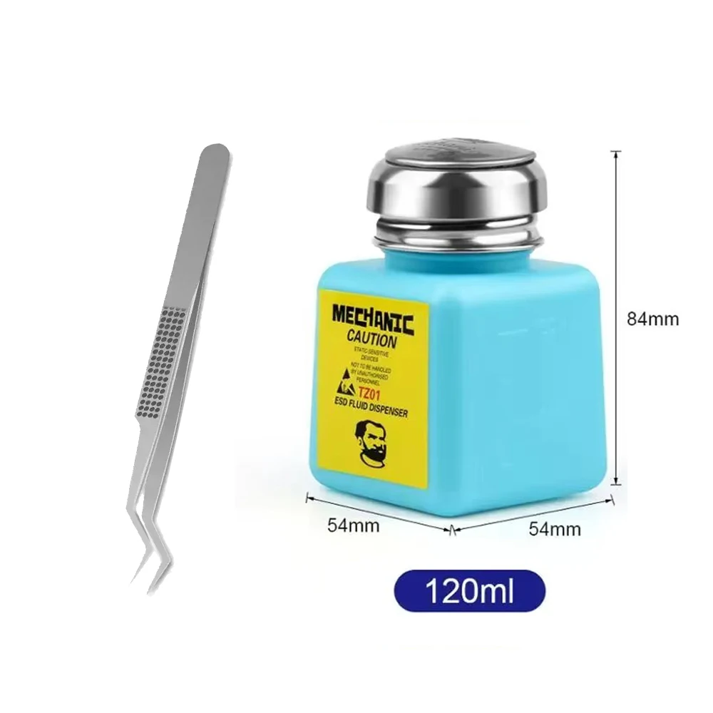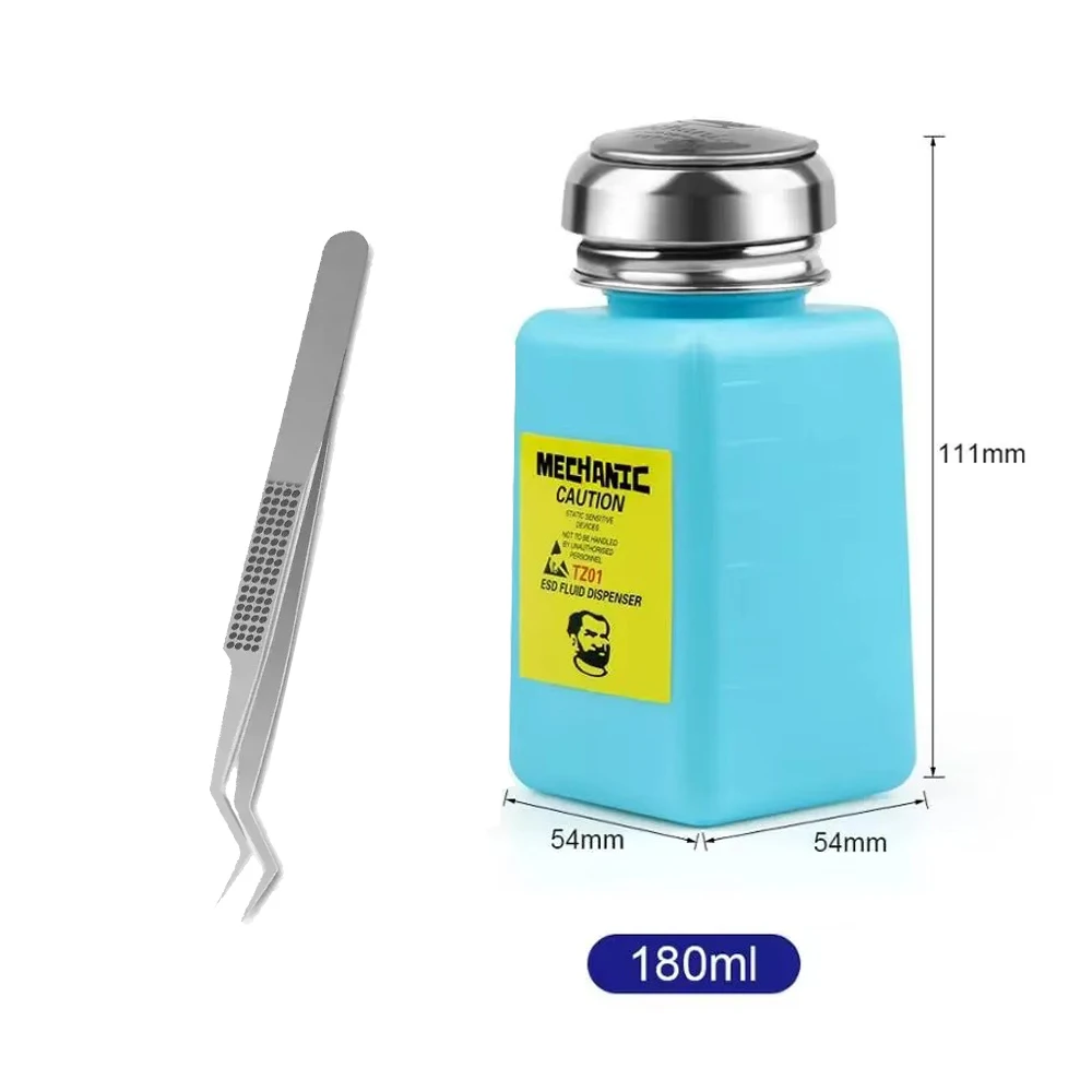 Experience precise and safe fluid dispensing with the MECHANIC TZ01 ESD Push-type Dispensing Alcohol Bottle, available in 120ml (54×54×84mm) and 180ml (54×54×111mm) capacities. Made from static-safe HDPE with a non-conductive metal cap and featuring an anti-static warning label, this lightweight and ergonomic tool ensures reliable handling during delicate electronics repair. Equipped with a built-in plastic straw for accurate application, it is ideal for dispensing soldering flux, cleaning solutions, and ESD-safe lubricants. Perfect for mobile phone motherboard repair, PCB component desoldering, and laptop GPU/CPU maintenance, offering professional-grade performance in a portable design.