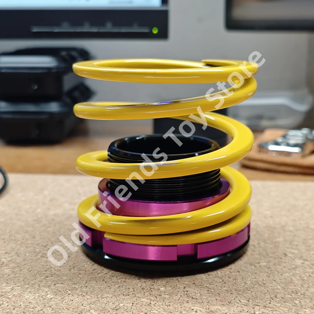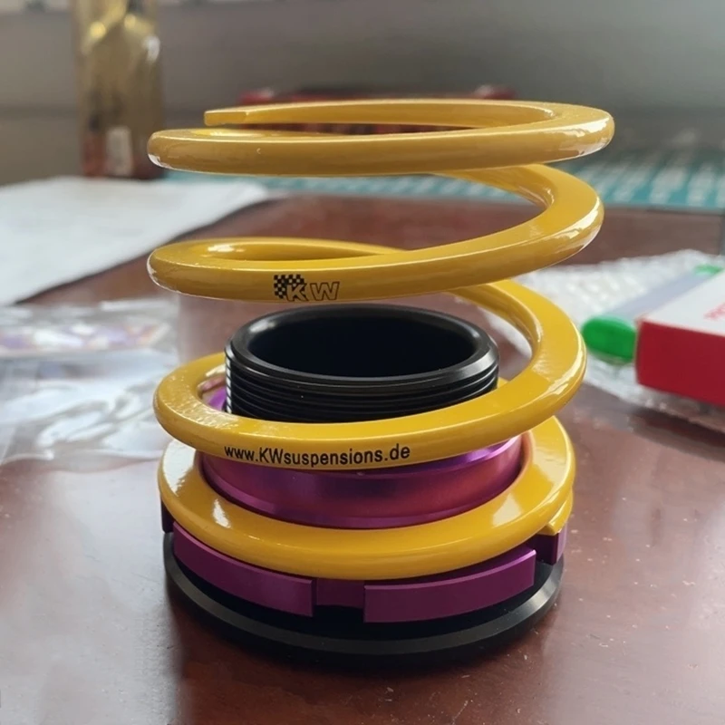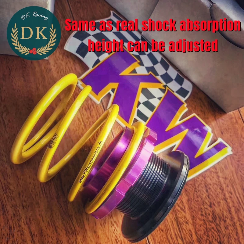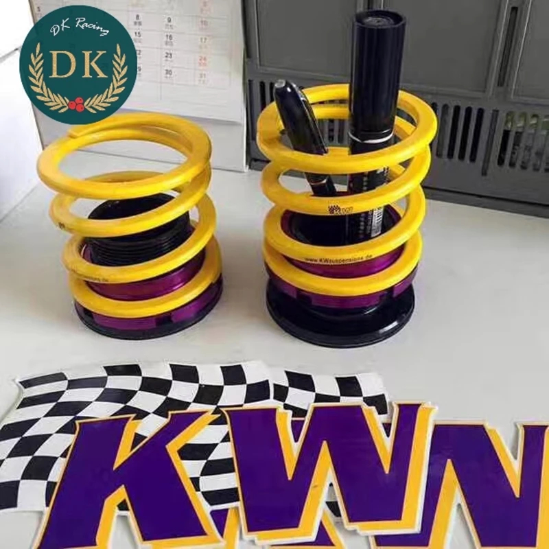 - Design inspired by KW V3 shock absorbers, featuring a bright yellow coil spring with black printed branding and a checkered logo, emphasizing mechanical aesthetics.