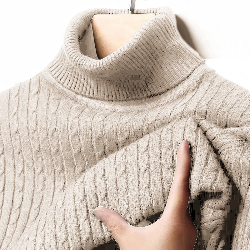 Experience cozy warmth and timeless style with this men's beige turtleneck sweater, meticulously crafted from polyester, nylon, and rayon. Its heavyweight knit offers durability and insulation perfect for autumn and winter. The r ibbed jacquard pattern with vertical lines creates a textured, elegant surface that feels soft yet substantial against the skin. The high, folded-over turtleneck enhances warmth and adds a sophisticated touch, while the classic pullover design ensures easy styling for casual occasions. Designed without closures or hoods, this sweater emphasizes simplicity and comfort, making it a versatile staple in your wardrobe. Whether you’re layered up for chilly days or seeking a stylish layer, this sweater combines function and fashion effortlessly.