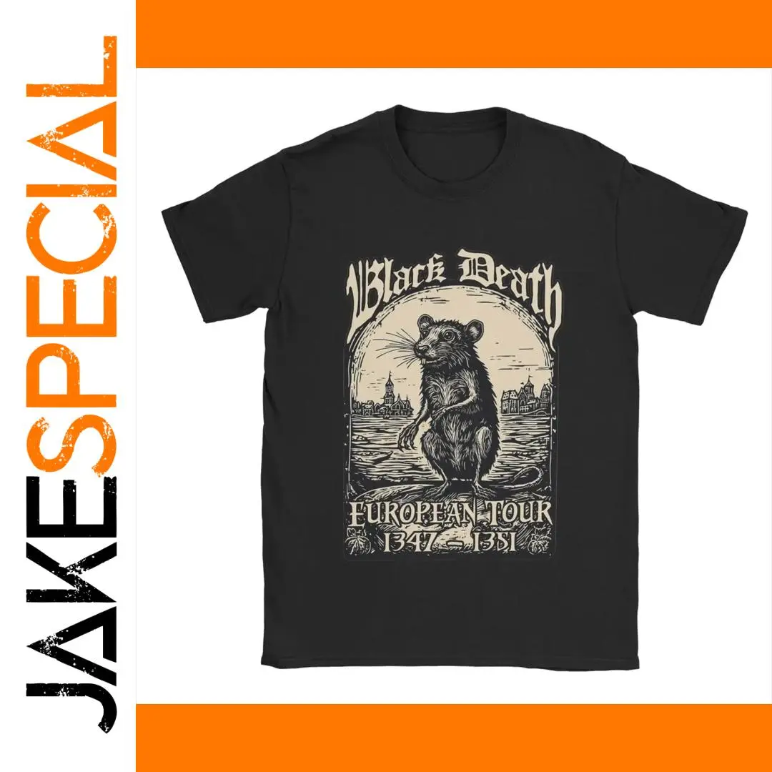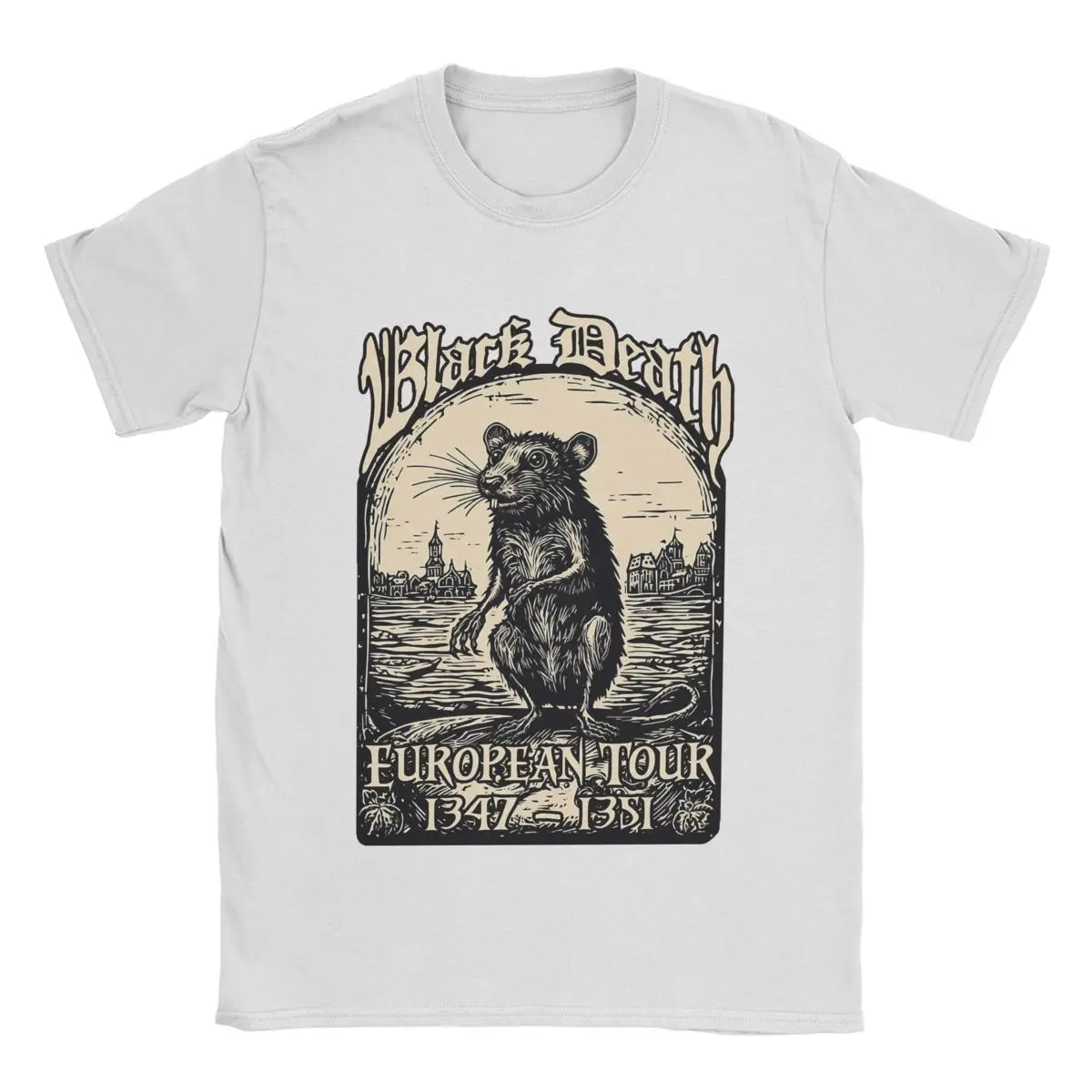 Experience a blend of vintage art and edgy style with this men's Black Death European Tour T-shirt. Made from breathable, lightweight cotton, it offers comfort for everyday wear, especially suitable for winter layering. The graphic design features a detailed illustrated rat standing upright, set against a stylized cityscape background enclosed within an arched frame that mimics a window. The monochromatic shades of beige and tan contrast beautifully against the black fabric, giving it a distressed, vintage appearance. The bold gothic-style text “Black Death” above and the historical date below evoke a dark, dramatic aesthetic that makes this T-shirt stand out. Its classic round neckline and short sleeves ensure a relaxed fit for any casual occasion.