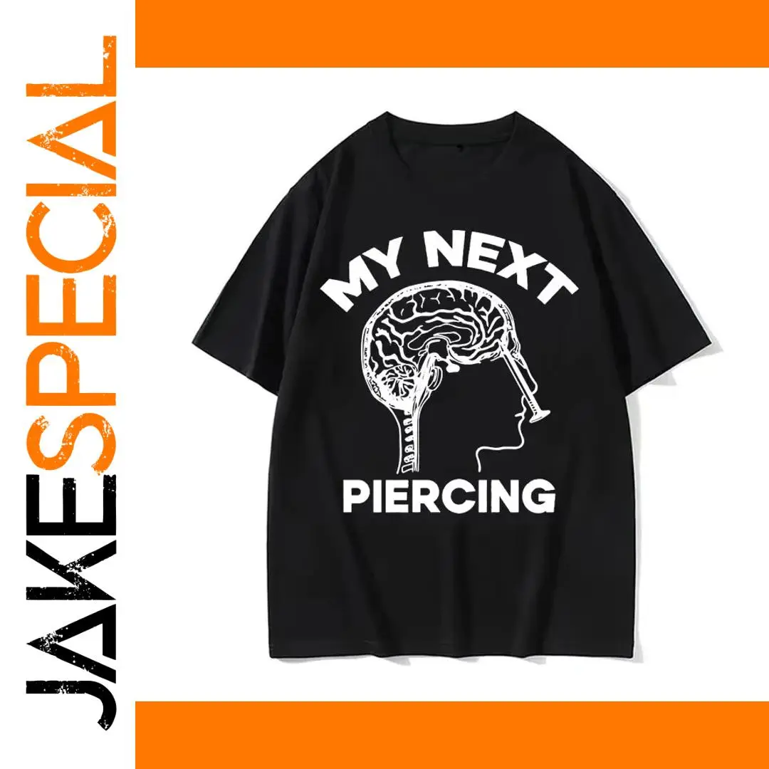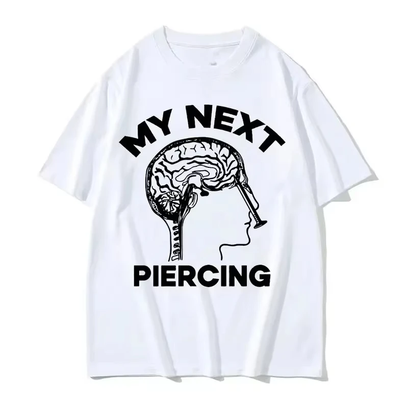 Imagine yourself confidently wearing this striking black T-shirt that captures attention instantly. Crafted from a breathable cotton-polyester blend, it offers comfort for all four seasons, perfect for casual outings or streetwear fashion. The bold printed graphic features a stylized white outline of a human head in profile, with a detailed depiction of the brain and a large syringe passing through it, adding a humorous yet edgy touch. Framed by large white uppercase text, reading “MY NEXT ITEM” above and “PIERCING” below, the design is minimalist but impactful, embodying a playful street style inspired by Y2K trends. Easy to care for and versatile, this shirt is your go-to for making a bold statement with a fun twist.
