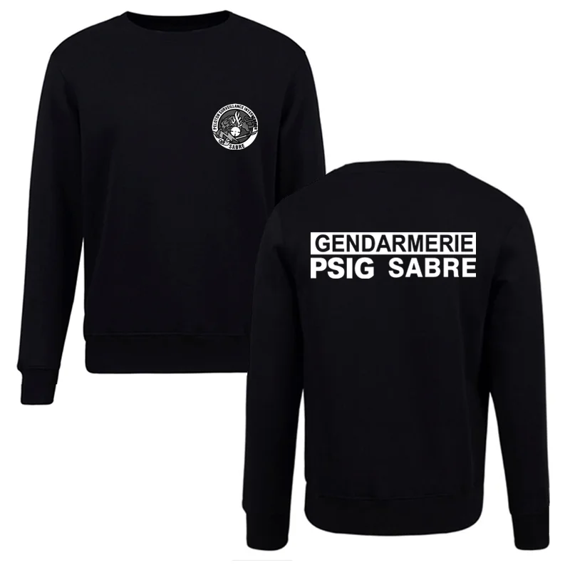 Step into a confident, casual look with this this men's Gendarmerie PSIG hoodie, crafted from soft, fleece-lined cotton for all-day comfort. Its black color with bold white print on the back and a subtle eagle logo on the front make it perfect for streetwear enthusiasts and fans of tactical-inspired fashion. Designed for spring and autumn, the hoodie offers a relaxed fit with a simple O-neck collar and ribbed cuffs around the sleeves and hem. The material's smooth texture provides a sleek, modern aesthetic while maintaining durability. Whether you're heading out for errands or meeting friends, this hoodie blends authority and style seamlessly, making every wearer feel powerful and fashionable in everyday wear.