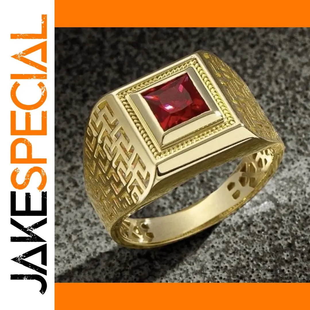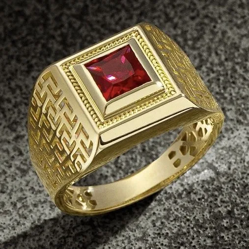 Imagine yourself wearing this striking men's wedding ring, designed to make a statement. Its wide, square-shaped band boasts a sleek gold or silver tone, catching the light beautifully. The top features a distinctive square hollow pattern that frames a vivid red cubic zirconia gemstone, securely held in prong settings. Small bead-like details around the gemstone add an elegant touch, while textured lattice-inspired sides give the ring a luxurious look. Crafted from durable zinc alloy, this contemporary piece combines smooth, polished surfaces with intricate patterned areas, making it perfect for parties, special occasions, or daily wear. Its versatile design complements any style, elevating your accessory game effortlessly. Whether for a wedding or an engagement, this ring is sure to add a fashionable edge to your ensemble.