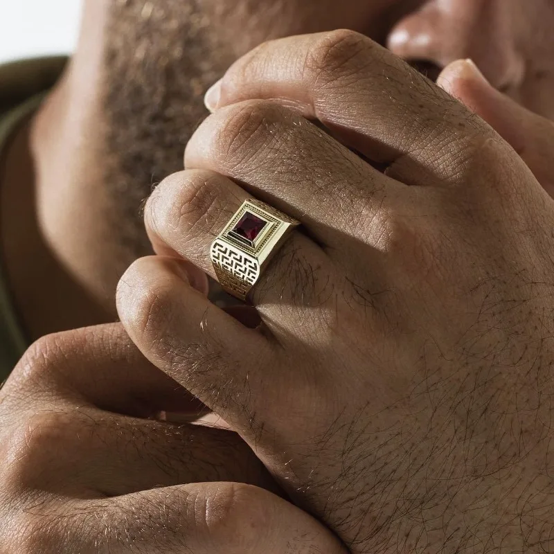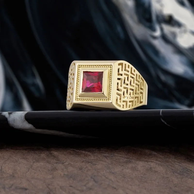 - The top displays a prominent square hollow geometric pattern that frames a vivid red cubic zirconia gemstone, securely fixed with a prong setting for added durability and elegance.
