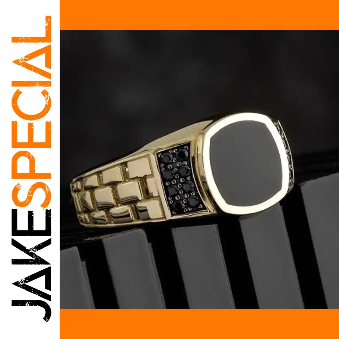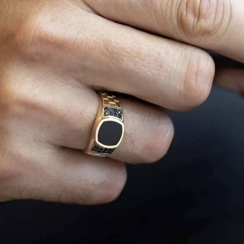 Step into sophistication with this trendy men's ring from NovoPublic, designed to elevate your look effortlessly. Crafted with a durable zinc alloy, the ring features a striking geometric pattern of rectangular and square segments that add texture and modern appeal. The top showcases a sleek, flat, square face, bordered in polished metallic finish, contrasting vividly with the black stone inlay made of durable material. On one side, a prong-set cubic zirconia gemstone adds a sparkle that catches the eye, perfect for making a statement at parties, weddings, or everyday events. With its versatile gold and silver color options, this ring complements various styles and outfits, bringing confidence and elegance to your wardrobe.