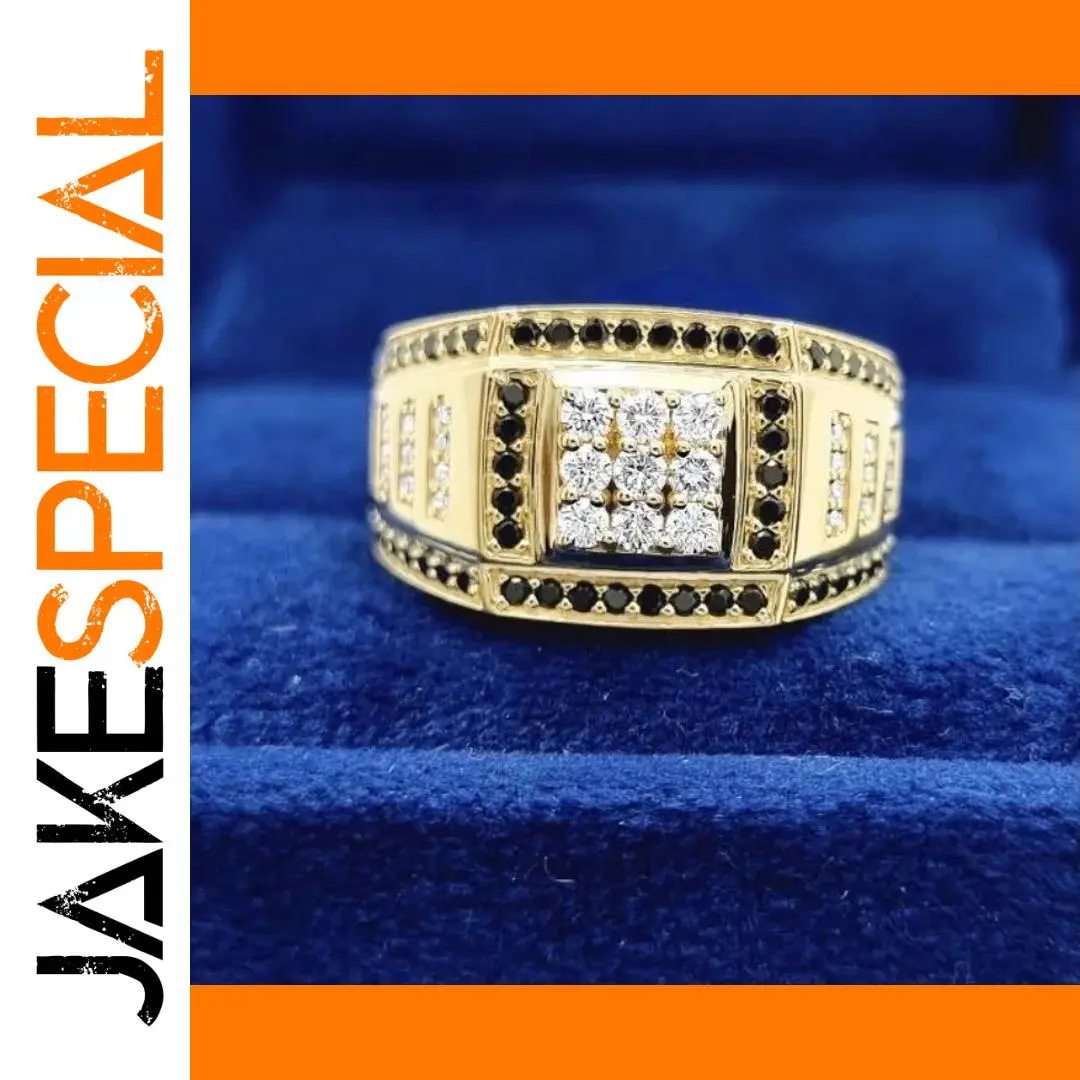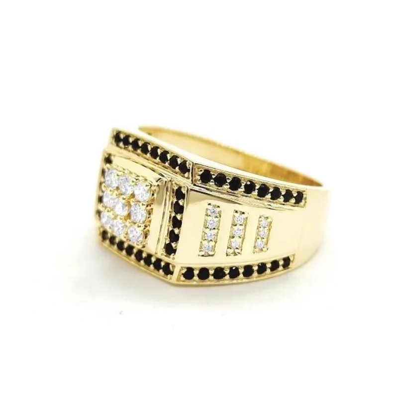 Imagine elevating your style with this luxurious men's fashion ring that combines bold, geometric design with eye-catching details. Crafted from durable zinc alloy with a stunning gold-tone finish, it radiates sophistication suitable for any party or special occasion. The wide, rectangular shape showcases a central 3×3 grid of sparkling white zircon stones, creating a luminous focal point. Surrounding the white stones, a row of contrasting black zircon stones adds depth and character. The sides feature intricate rectangular arrangements of small white zircon stones, enhancing the ornate appearance. The edges are lined with tiny black zircon stones in linear patterns for extra detail. Available in sizes 7-13, this ring offers a striking, luxurious touch for confident individuals seeking unique jewelry pieces.