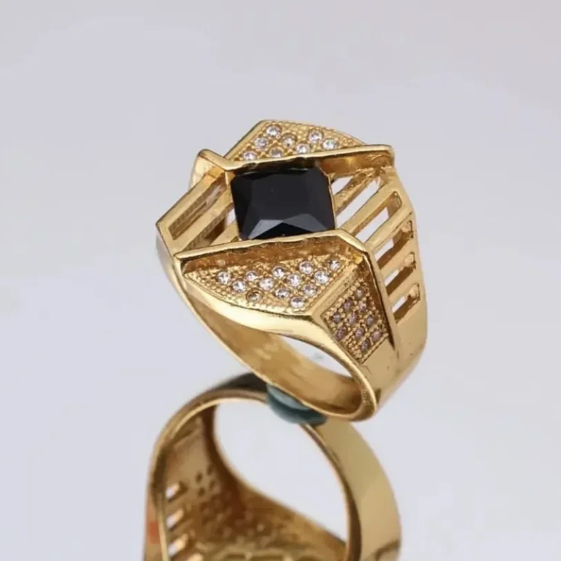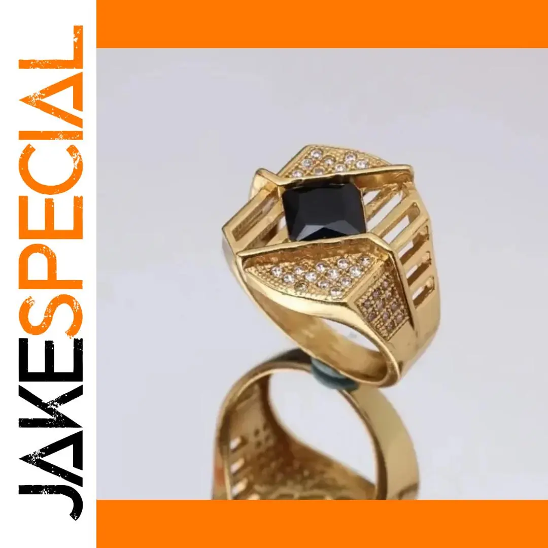 Elevate your style with this bold men’s cocktail ring featuring an 8mm wide gold-colored zinc alloy band with smooth, rounded edges. The ring showcases a striking geometric design with a prominent black square gemstone set horizontally in a prong setting, surrounded by layered openwork and parallel lines crafted from the same gold tone. Flanking the central stone are clusters of sparkling white zircon stones, adding an ornate touch. Available in sizes 7 to 13, this fashion-forward accessory is perfect for parties and stylish occasions, serving as both a statement piece and a mood tracker, combining contemporary design with eye-catching details.