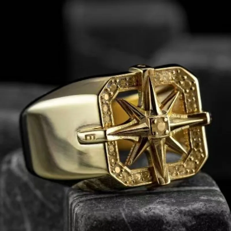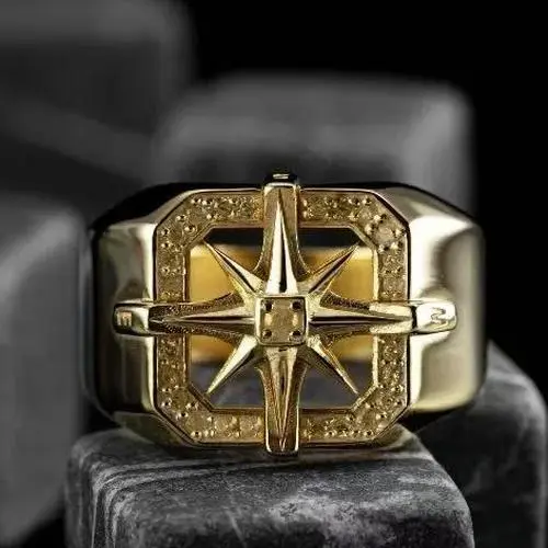 Elevate your style with this bold men’s cocktail ring, crafted from zinc alloy with an 8mm width. Featuring a striking geometric compass star motif set with sparkling zircon stones in a prong setting, this trendy piece showcases a polished, reflective gold-tone finish. Designed for party and fashion-forward occasions, the ring serves as a mood tracker and makes a confident statement. Available in sizes 7 through 13, it offers a perfect fit for all finger sizes. Its modern, luxurious design combines striking geometric patterns with intricate craftsmanship, making it an ideal accessory for those who want to stand out and express their bold personality.