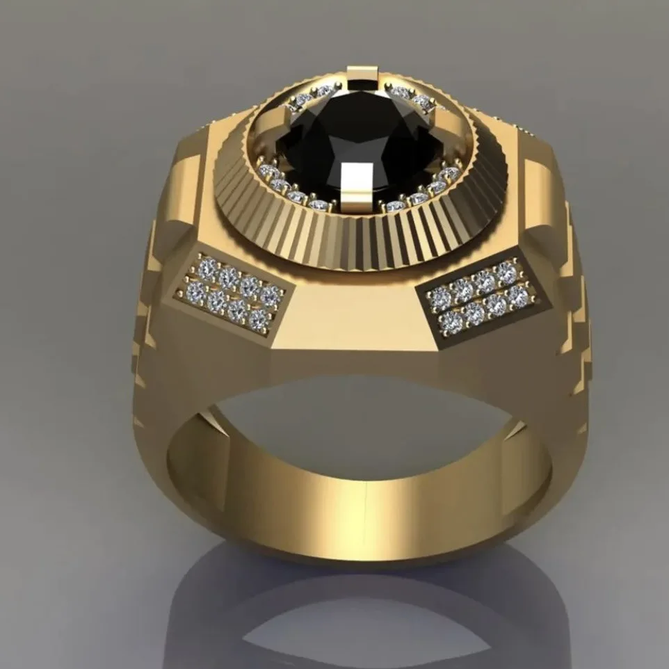 Experience the perfect blend of modern design and luxurious appeal with this men's gold-colored wedding ring. Crafted from durable zinc alloy, it features a striking 8mm wide face adorned with a geometric pattern and prong-set zircon stones. The central large black faceted stone creates a bold focal point, reflecting light beautifully from multiple angles. Surrounding this are small, sparkling zircon accents arranged in a circle, adding depth and brilliance. Flanked by rectangular panels embedded with tiny zircon stones, the ring combines industrial textures with elegant details. Its layered, textured surface with gear-like edges emphasizes contemporary fashion, making it ideal for weddings, parties, or everyday statement wear. This piece promises both style and sophistication.