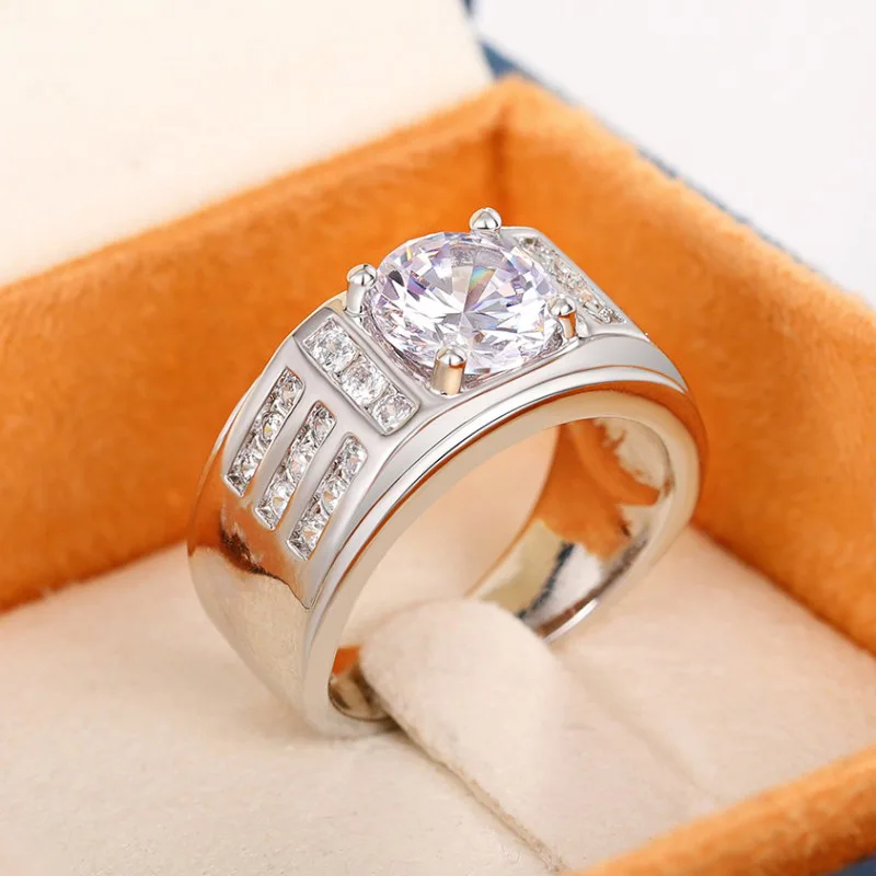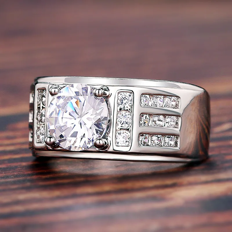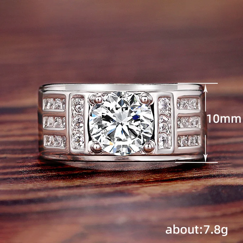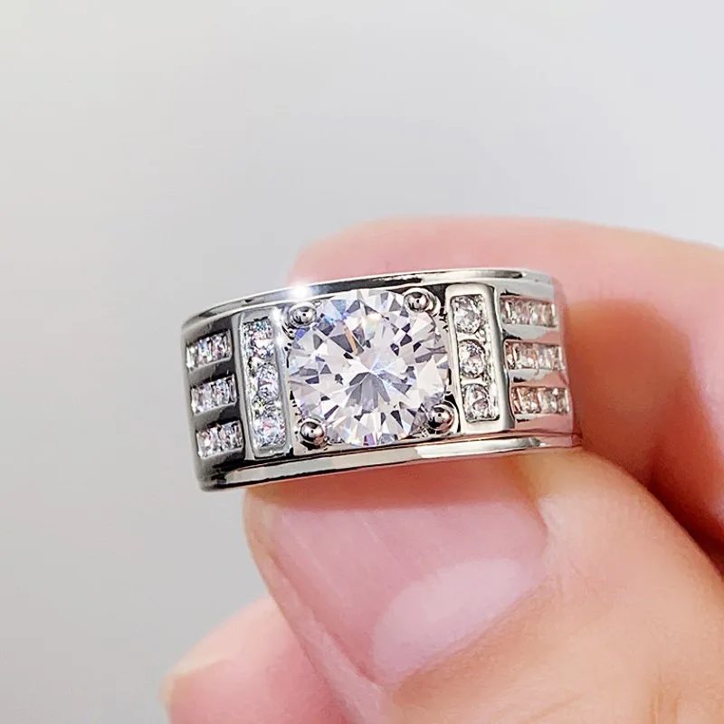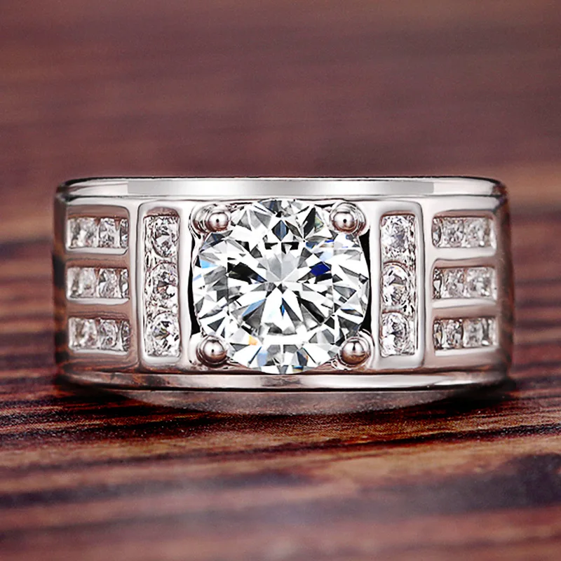 Imagine yourself confidently wearing this stunning men's wedding ring, crafted from high-quality sterling silver with a polished, shiny finish. The bold, wide band exudes masculinity, while the delicate details add a touch of romance and sophistication. The prominent round prong-set stone, resembling a diamond or moissanite, creates a captivating sparkle that catches the light beautifully. Around the band, smaller square-shaped stones are channel-set, providing an intricate layered look. Ideal for special occasions like engagements, weddings, or anniversaries, this ring effortlessly combines a modern style with elegance. Designed to suit both daily wear and significant moments, it promises to become a cherished part of your jewelry collection.