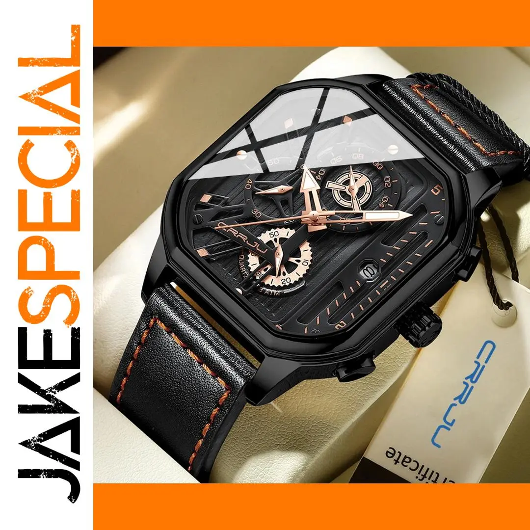 Indulge in the sophisticated charm of this CRRJU Men's Square Dial Leather Quartz Chronograph Watch. Picture yourself adorned with this exquisite timepiece that seamlessly blends luxury and style, enhancing any outfit with its chic square design. The durable leather band not only assures comfort but also promises longevity, making it your perfect companion for every occasion. Feel confident knowing that the reliable quartz movement keeps your schedule on track, while the sporty chronograph feature adds a dynamic flair to your wrist. Embrace this watch as your go-to accessory for casual outings and formal events alike.