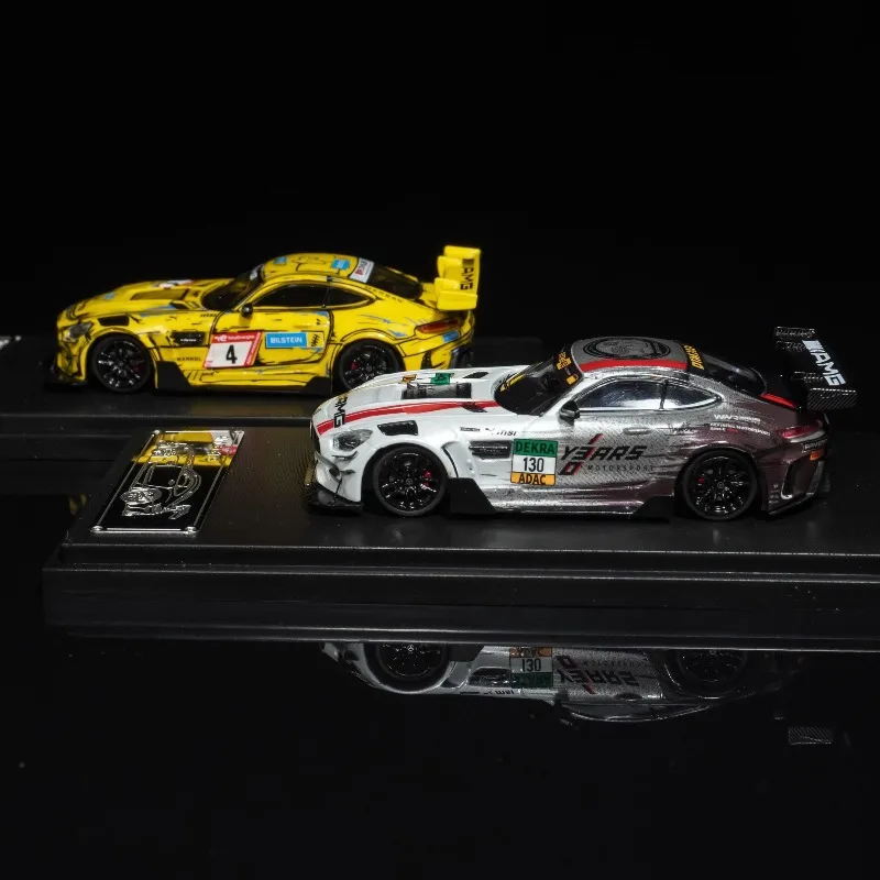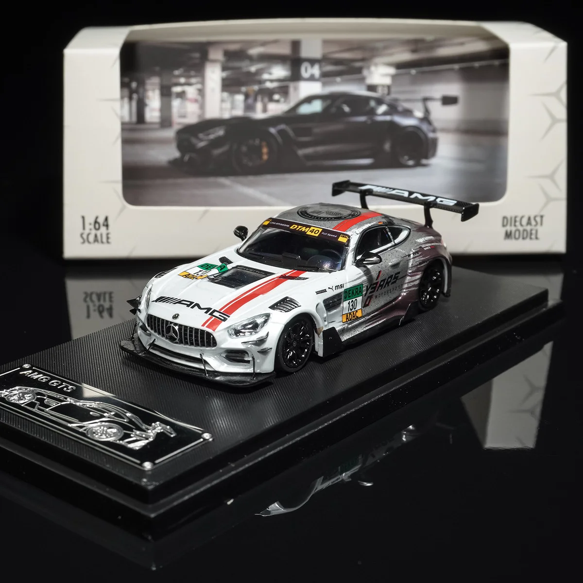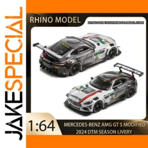 Experience the thrill of racing with this highly detailed 1:64 scale Mercedes-AMG GT S diecast model, designed to capture the essence of the 2024 DTM seasoned livery. With a sleek metallic silver finish accented by bold red stripes, this collectible car exudes modern sophistication and dynamic racing energy. The realistic aerodynamic features include a large black rear wing spoiler, aggressive front grille with vertical slats, angular headlights, and air intakes, reflecting actual racing design. Its durable metal construction ensures a refined look, while subtle decals and sponsor graphics enhance authenticity. Perfect for display or collection, this model invites you to imagine yourself on the racetrack, bringing racing excitement into your space with fine detail and craftsmanship.