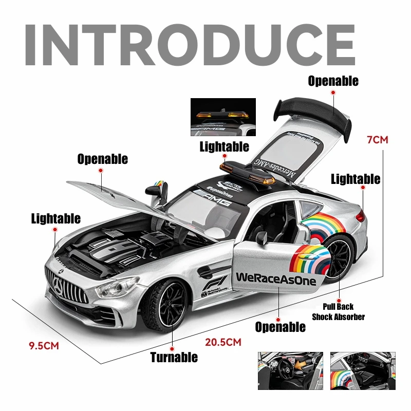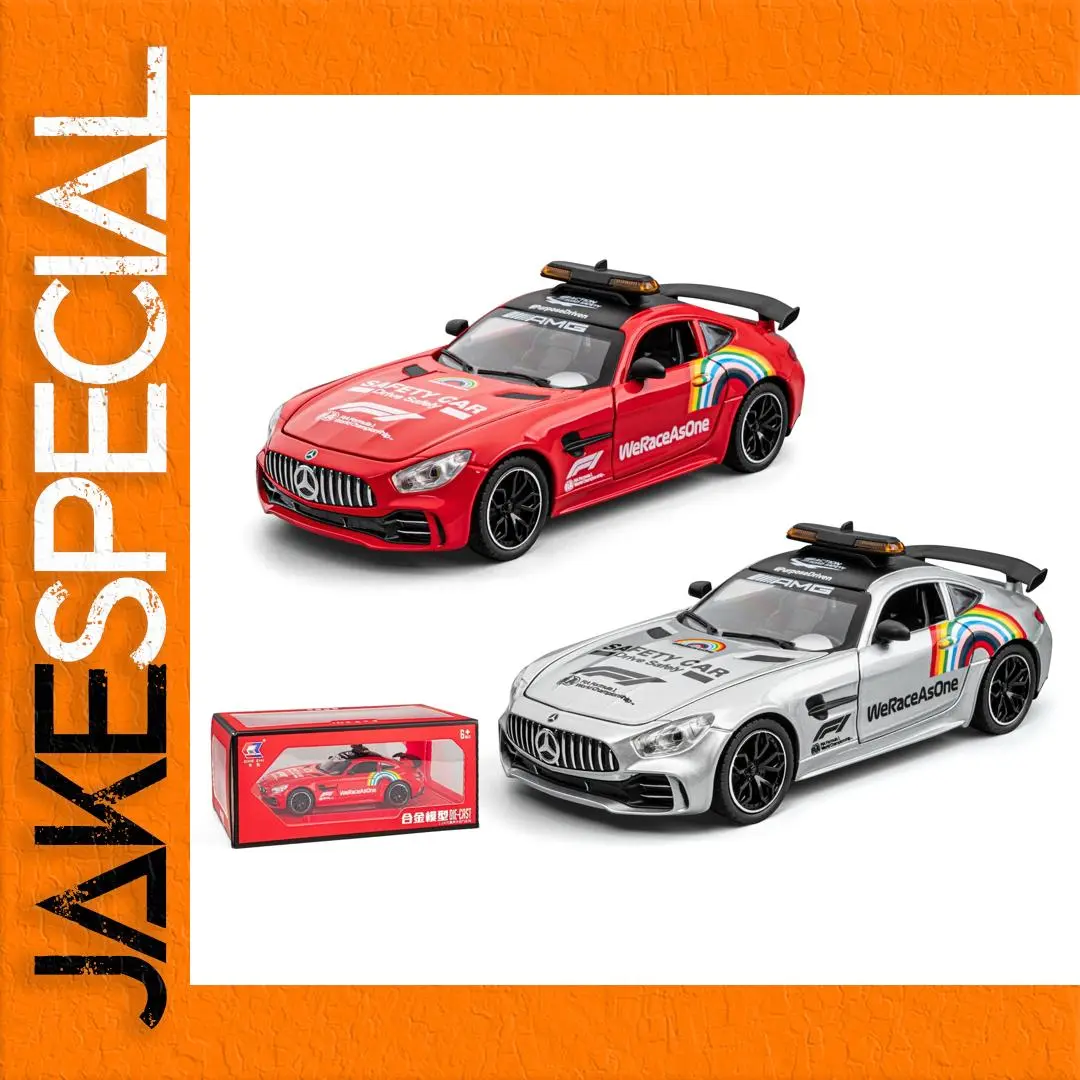 Imagine enhancing your collection with this beautifully crafted 1:24 scale diecast metal model of the Mercedes-AMG GTR Safety Car from the 2020 Formula 1 season. Available in vibrant red and sleek silver, this miniature captures the dynamic, aerodynamic design of the race car. Every detail, from the decals reading “SAFETY CAR” and “One Safety,” to the eye-catching rainbow stripe running along its sides, reflects the precision craftsmanship. The transparent windows reveal an interior loaded with detailed components, while components like the roof-mounted orange safety light bar and black spoke wheels add realism. This model blends durability, elegance, and sporting excitement, making it a perfect display piece that brings the thrill of racing right into your space.