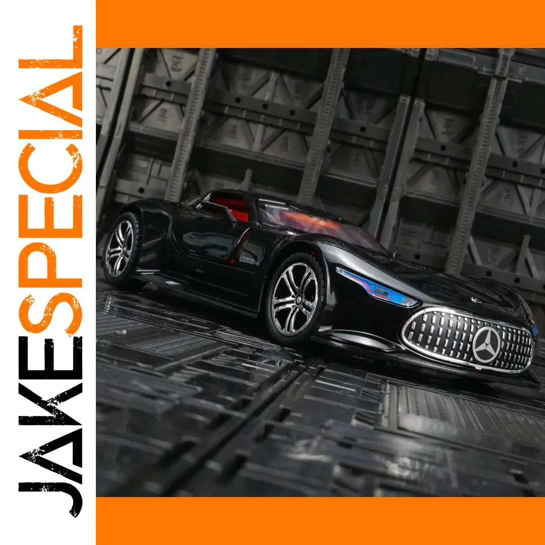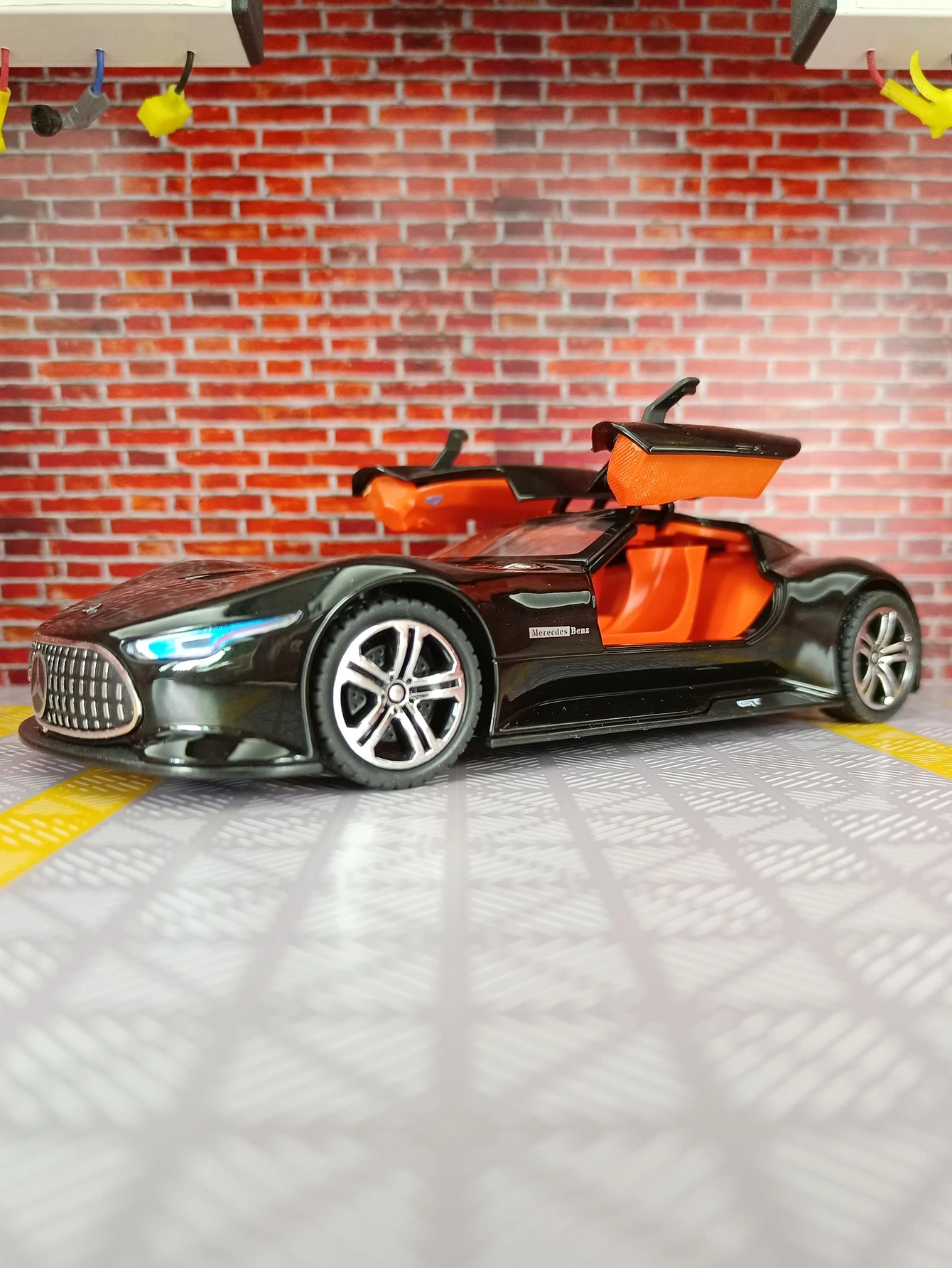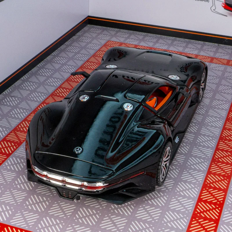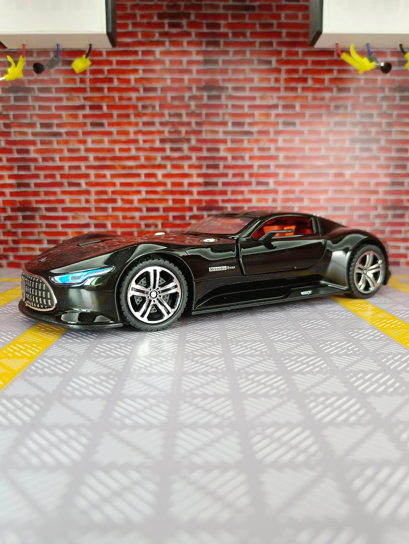 Experience the thrill of owning a highly detailed 1:24 scale diecast Mercedes AMG VISION GT supercar model, crafted from durable alloy metal in sleek black and silver finishes. This aerodynamic vehicle features smooth curves, sharp lines, and a glossy exterior that captures the essence of high-performance design. Notable details include a front grille with horizontal chrome bars, slim LED-inspired headlights with blue and white accents, multi-spoked metallic rims, and low-profile tires. Enhanced with simulated sound and lighting functions, this collector’s piece is perfect for enthusiasts aged 14 and above, offering an impressive display of realism and craftsmanship.