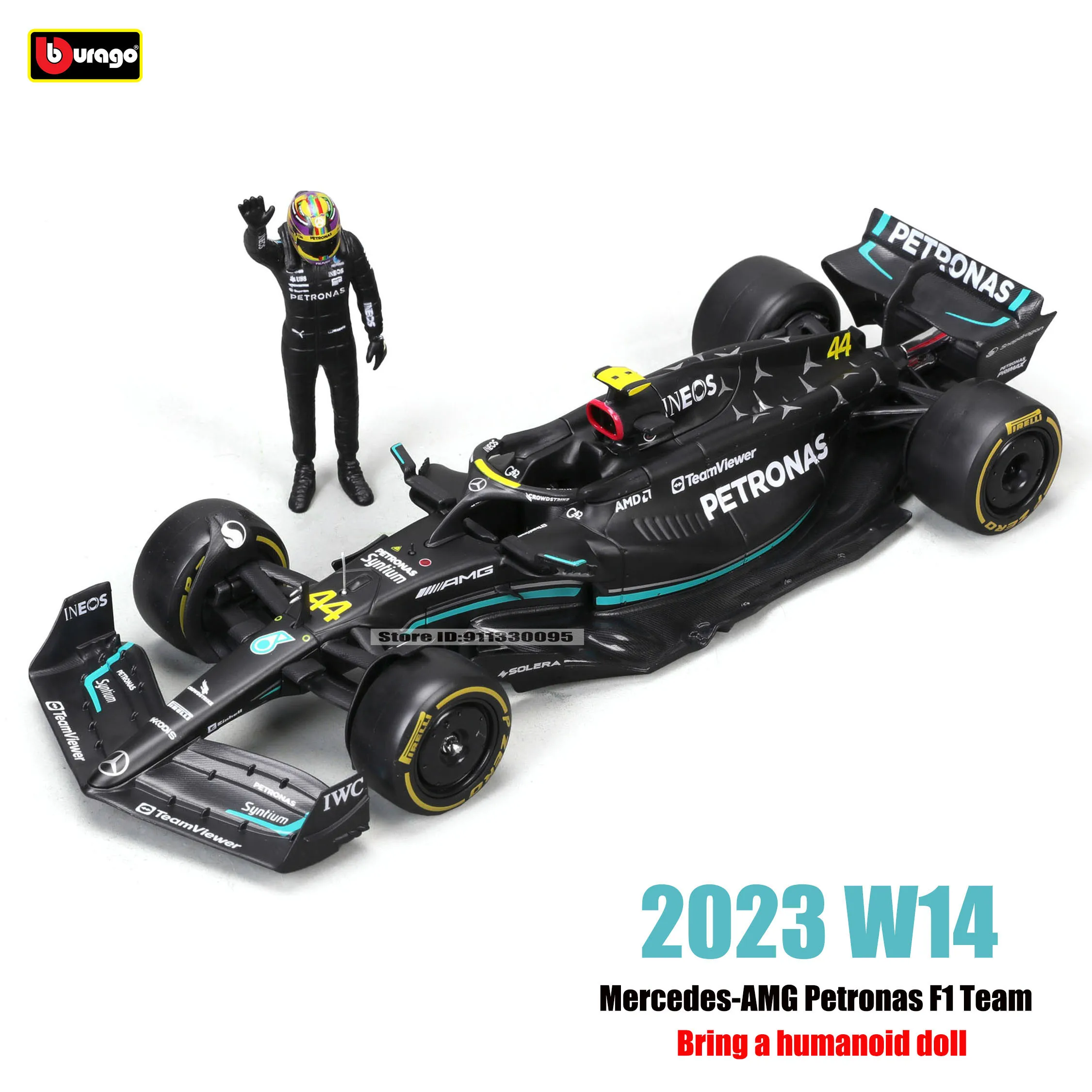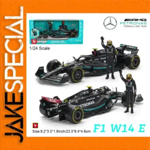 Step into the world of high-speed racing with this stunning diecast model of the 2023 Mercedes-AMG W14 Formula One car, produced by Bburago. Crafted with meticulous attention to detail, this 1:24 scale model showcases the sleek, aerodynamic design of the real car, finished in glossy black with vibrant turquoise accents that highlight its modern racing aesthetic. The intricate surface features include finely detailed front and rear wings, sidepods, and a precise cockpit, capturing every nuance of the original. Realistic yellow-lettered tires and black rims add authenticity, making it feel like you hold a piece of the racing circuit. It's perfect for collectors and enthusiasts who admire craftsmanship and speed, bringing Formula One racing into your collection.