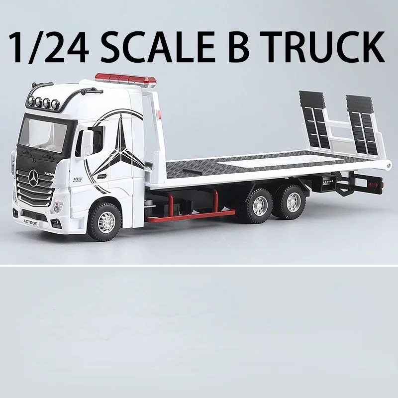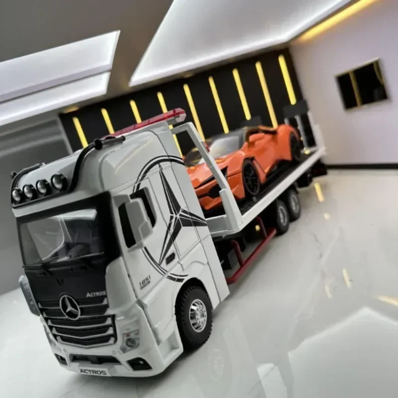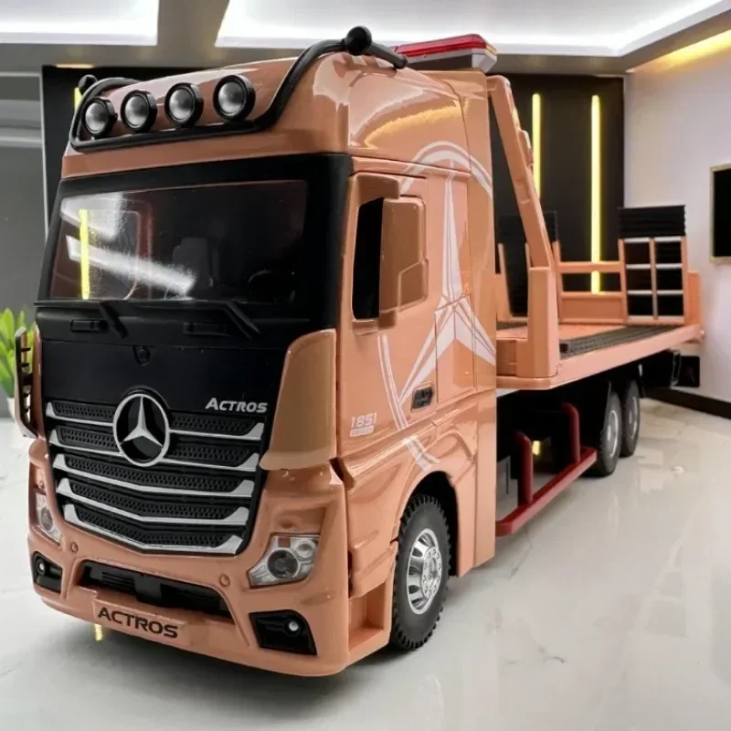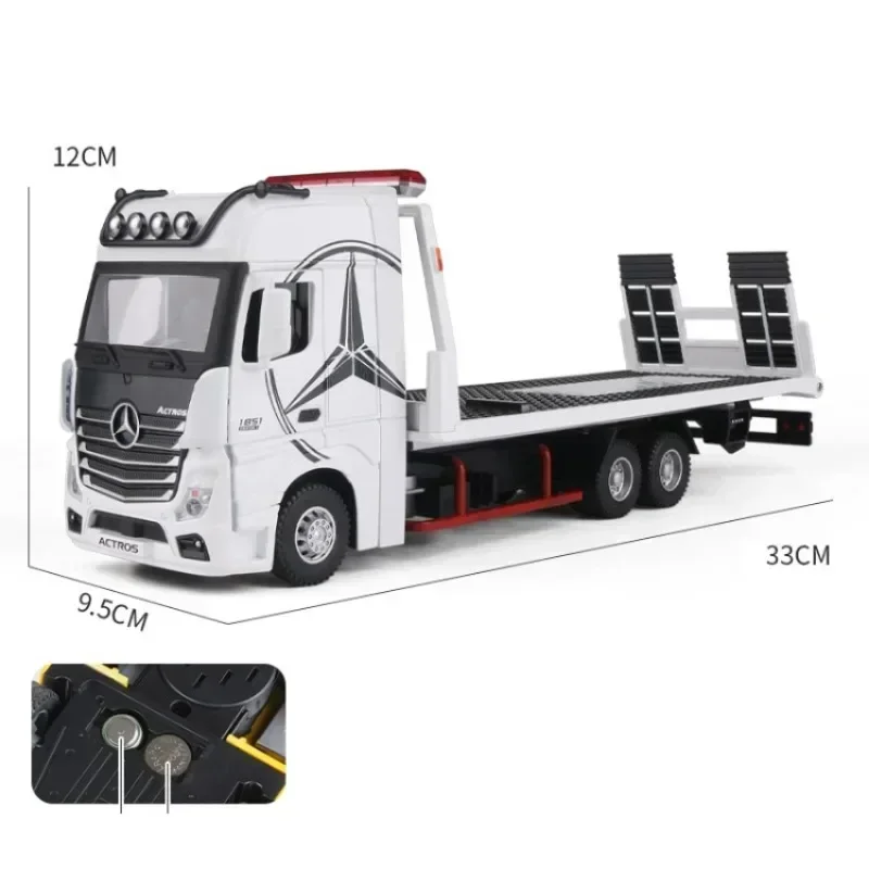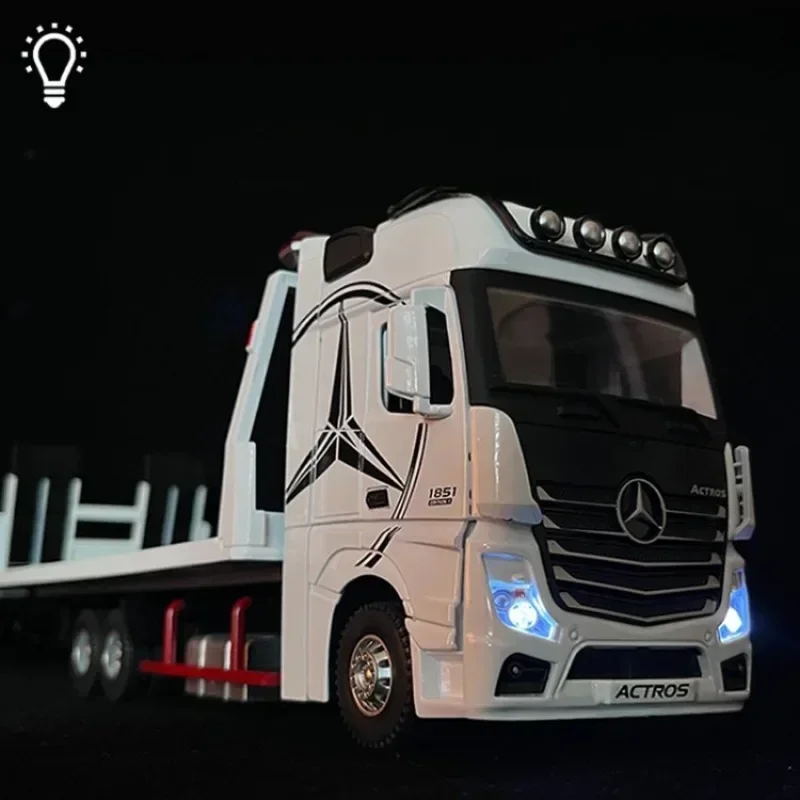 Experience the detailed craftsmanship of this Mercedes-Benz 1851 diecast truck model, perfect for display or collection. Built with a sturdy metal body, this 1:24 scale replica captures the sleek, modern design of the original, with aerodynamic contours and a polished white finish. The realistic cab features a black front grille with horizontal slats, a large transparent windshield, and side windows. Small auxiliary lights on the roof and finely detailed headlamps add to its authenticity. The attached flatbed trailer has textured surfaces, side rails, and matching color. Available in various colors including pink, blue, and yellow, with boxed options. It also boasts simulation sound and light features, making it a striking, interactive display piece for enthusiasts.