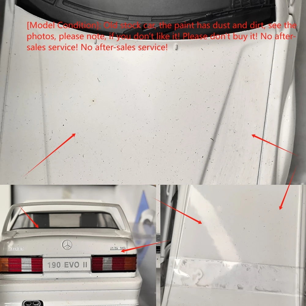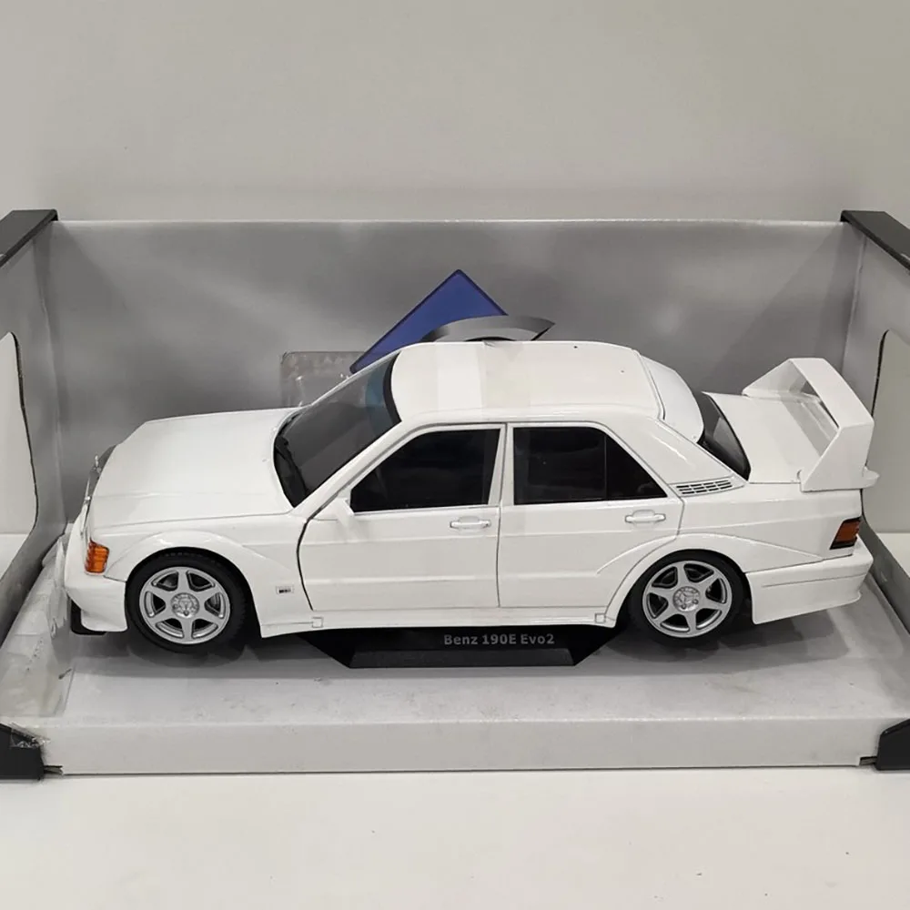 This 1:18 scale die-cast model of the Mercedes-Benz 190E W201 1990 EVO 2 offers a realistic and detailed representation, crafted from alloy, plastic, and rubber. Featuring a primarily white exterior with subtle panel lines, clear molded headlights, a rectangular grille with a classic emblem, black window trim, black side skirts, silver five-spoke alloy wheels, and low-profile tires, it embodies a sleek, sporty aesthetic. This collectible model is fully enclosed, perfect for display, hobbies, or as a gift, and shows minor signs of age and paint imperfections. The model comes in a colorful box, designed for enthusiasts aged 14 and up, emphasizing its static, decorative purpose.