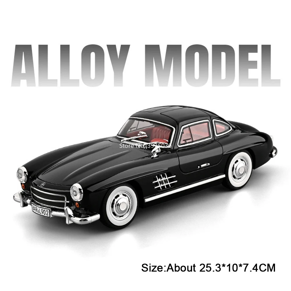 Bring home the elegance and craftsmanship of the vintage Mercedes-Benz 300SL with this meticulously crafted 1:18 scale diecast model. Its glossy black finish mimics real metal, highlighting smooth curves and elegant lines that reflect the iconic sports car design. The model features authentic chrome accents around the headlights, grille, and bumper guards, adding a touch of classic sophistication. Transparent windows reveal a detailed red interior with dashboard and seating components. The textured rubber tires with multi-spoke hubcaps enhance realism, while openable doors let you explore the interior. With sound, light, and pull-back functions, this miniature vehicle combines aesthetic beauty with interactive features perfect for collectors or as eye-catching home decor.