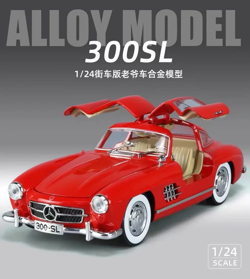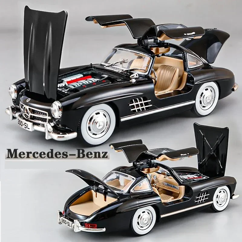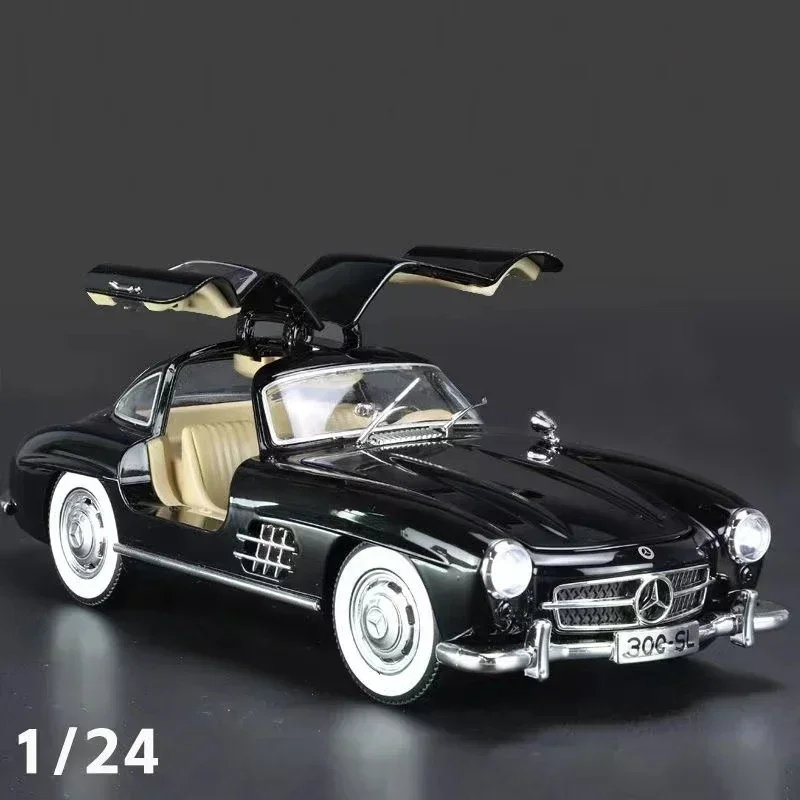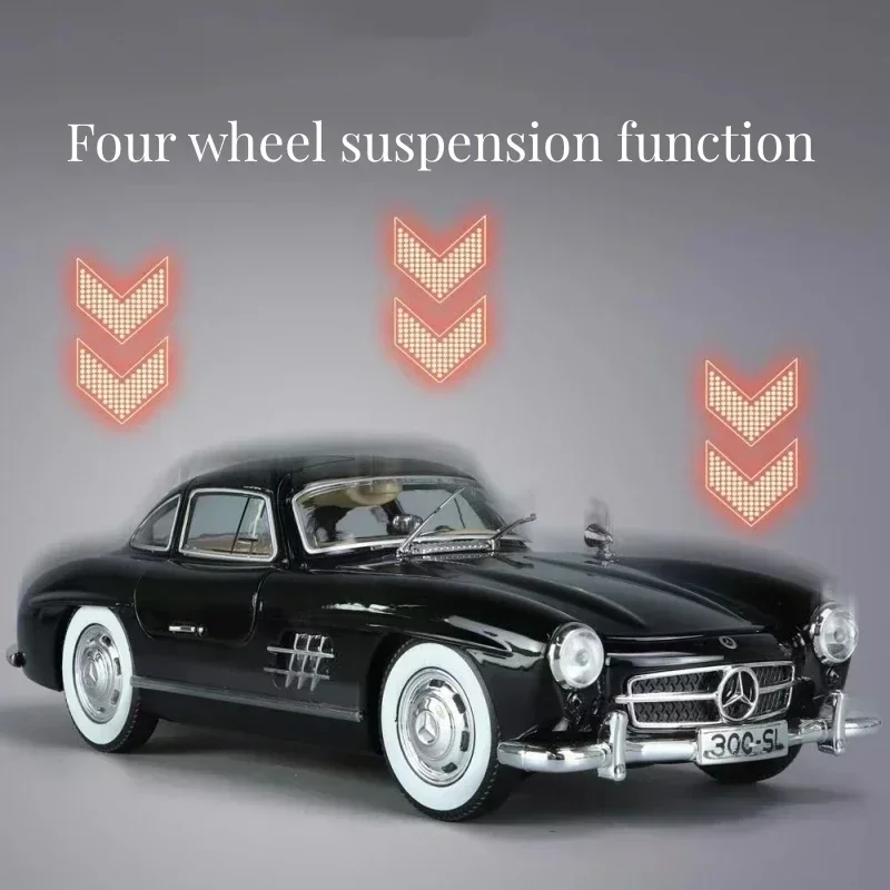 Experience the timeless elegance of the 1:24 scale diecast Mercedes Benz 300SL alloy model, crafted with meticulous attention to detail. Featuring a sleek, vintage black exterior with a glossy finish, the model showcases authentic design elements such as an aerodynamic body, gull-wing doors, and intricate hubcap details. Equipped with functioning sound and light features, it offers a captivating display as a fashionable collectible ornament. Made from durable metal and available in various colors including blue, green, red, and white, this non-electric model is perfect for collectors aged 14 and above who appreciate craftsmanship and classic automotive design.