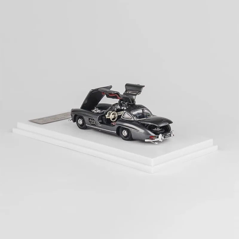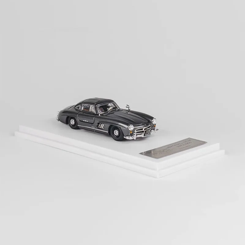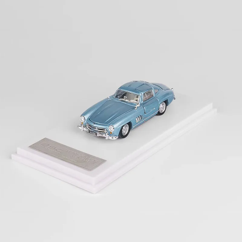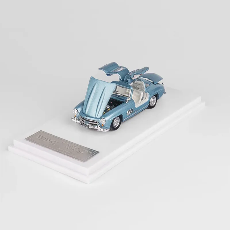 This highly detailed diecast replica of the Mercedes-Benz 300SL features a 1:64 scale, crafted from alloy for a vintage, collectible aesthetic. Finished in a glossy light blue with a smooth, rounded body design, it showcases iconic gull-wing doors, with one door open to reveal an intricately detailed interior. The model’s front features a rounded grille with the Mercedes-Benz emblem, complemented by realistic headlights and bumper, while the rear displays a sleek, curved silhouette with tail lights. The authentic wheels, with visible tread, enhance its realism. Perfect for display or collection, this fragile, non-electric model is recommended for ages 14 and above.