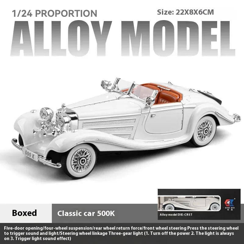 Discover the timeless charm of this highly detailed diecast model of the Mercedes Benz 500K. Crafted from alloy metal with a polished, shiny silver finish, this model captures the luxury and vintage elegance of the 1930s. Its smooth, curved lines offer a graceful, elongated silhouette, accented by chrome details on the grille, headlights, and side fixtures. Classic features include the large, round headlights and spoked wheels, along with subtle vent details on the long hood and small, rounded side mirrors that enhance its vintage aesthetic. Designed for display, this model also incorporates sound and light functions to bring it to life. Its detailed craftsmanship makes it perfect for collectors and car enthusiasts alike, elevating any desk or shelf with its nostalgic beauty.