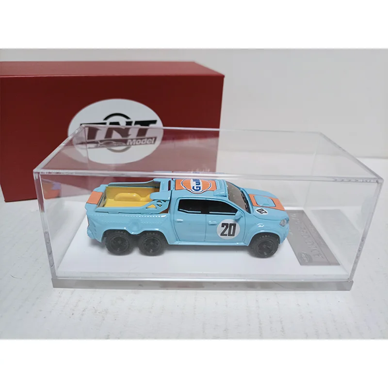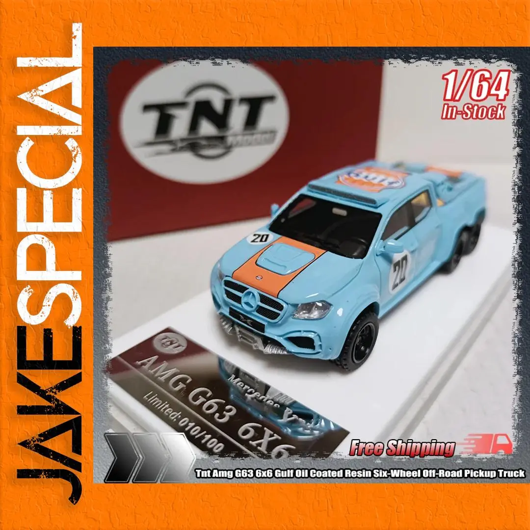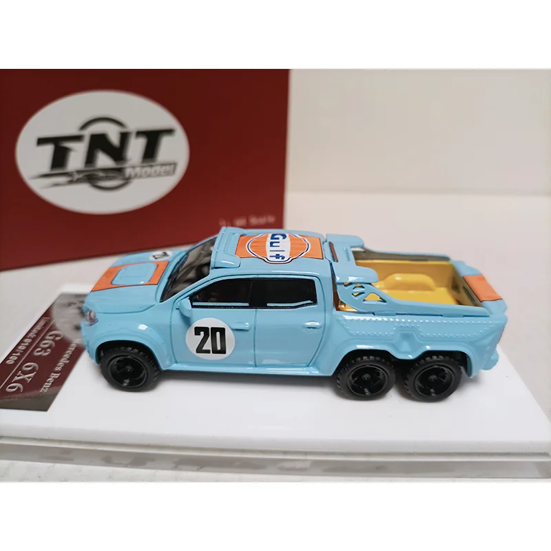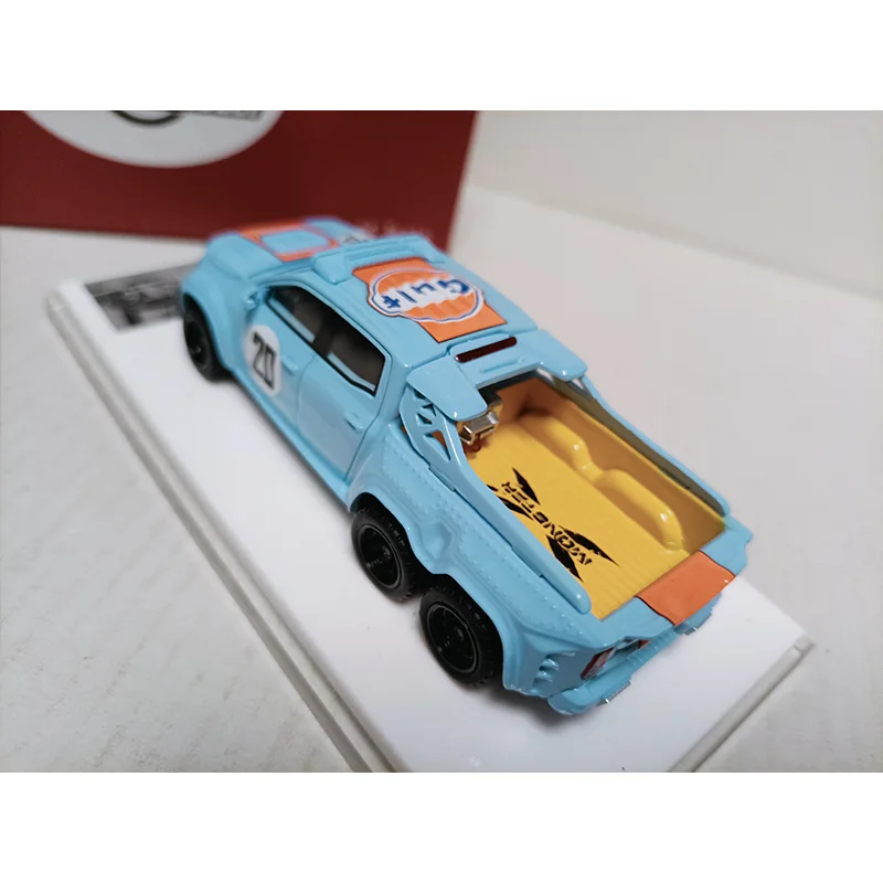 This 1:64 scale resin die-cast model depicts a Mercedes-Benz AMG G63 6×6 off-road pickup truck in a striking Gulf Oil coated finish. The vehicle features six black detailed wheels with textured tires, a bold orange vertical racing stripe running from hood to bed with a stylized Gulf Oil logo, and a textured cargo bed matching the vibrant blue scheme. The front grille displays the Mercedes-Benz emblem, complemented by clear molded headlights and a textured silver skid plate. Subtle details include side mirrors and tinted windows, emphasizing its rugged, sporty aesthetic perfect for adult collectors and enthusiasts.