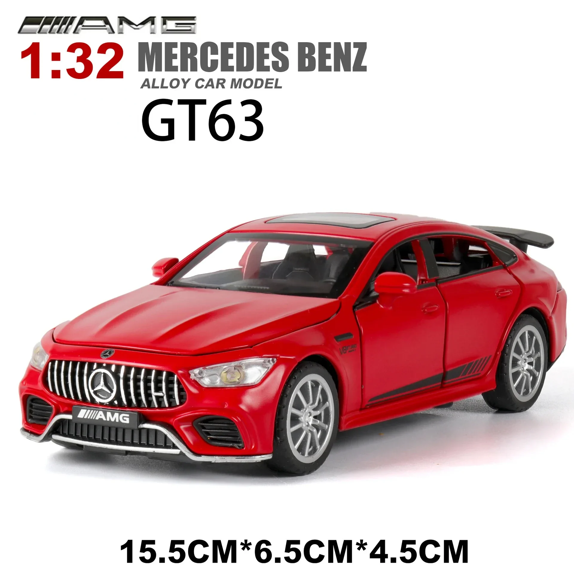 - The model measures 1:32 scale, capturing precise proportions of the Mercedes-Benz AMG GT63 sports car with a vivid, eye-catching finish in red.