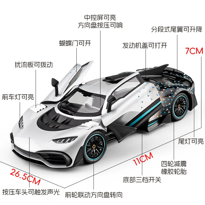 Experience the thrill of owning this meticulously crafted 1:18 scale diecast model of the Mercedes Benz AMG ONE 300SL GTR GT supercar. Made from high-quality alloy metal, this miniature exudes durability and a luxurious feel. Its sleek, glossy finish—available in colors like black, silver, red, green, orange, or white—captures the breathtaking design of the original vehicle. With aerodynamic details such as a prominent rear wing, carbon fiber-like elements, sculpted vents, air intakes, and a mesh rear diffuser, this model showcases precision craftsmanship. The multi-spoke rims and low-profile tires emphasize its sporty stance. Perfect for collectors and enthusiasts, it brings high-performance aesthetics into your space, allowing you to admire every detail of this high-end supercar in miniature form.