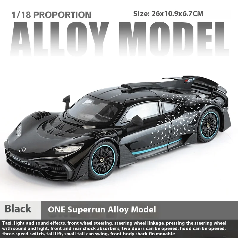 Experience the thrill of owning this meticulously crafted 1:18 scale diecast model of the iconic Mercedes-Benz AMG ONE supercar. Featuring a sleek metallic silver finish, it captures the essence of high-performance automotive design. The intricate black graphics and stylized line details on the body emulate aerodynamic features and sponsorship decals, bringing the miniature to life. The model showcases a low, aggressive stance with prominent vents, streamlined headlights, and a sharply raked windshield, reflecting modern supercar aesthetics. The transparent roof section adds a touch of sophistication, revealing a glimpse of the detailed interior. The large rear wing or spoiler significantly enhances the sporty appeal. Perfect for collectors, display enthusiasts, or gifting, this model’s realistic multi-spoke wheels and functional sound and light features elevate its collectible value, making it an exceptional addition to any automotive collection.