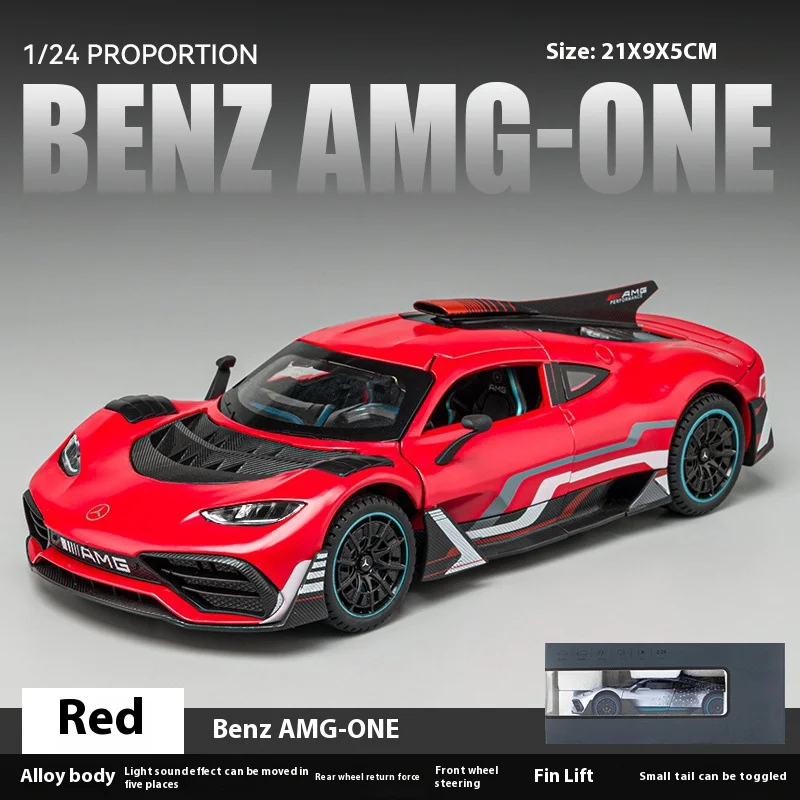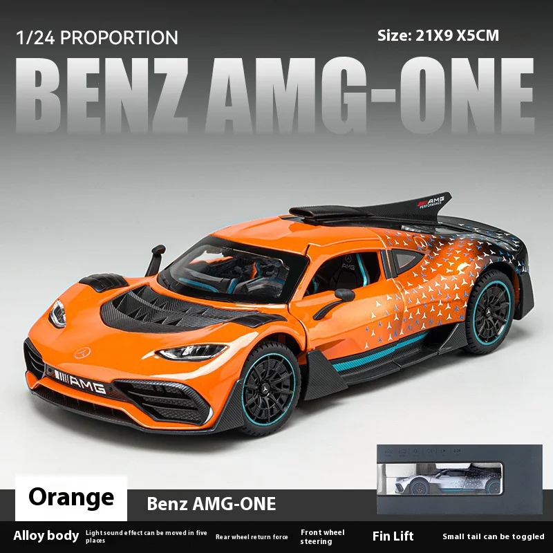 This 1:24 scale diecast model of the Mercedes Benz AMG ONE sports car is crafted from lightweight alloy metal, showcasing a sleek, aerodynamic design with sharp contours, aggressive front grille, slim angular headlights, and a prominent rear wing. Featuring functional sound and light elements, it captures the high-performance aesthetic perfectly. Available in vibrant colors—green, orange, red, and silver—each with a protective box. The model is suitable for collectors aged 18 and above, is certified with 3C certification, and offers both model and semi-model options. A stunning display piece that embodies precision engineering and modern sports car elegance.