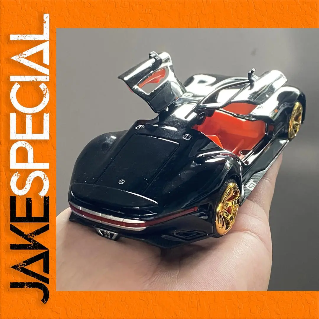 Imagine adding this stunning diecast model of the Mercedes-Benz AMG VISION GT to your collection, showcasing a perfect blend of futuristic design and refined craftsmanship. This 1:32 scale replica highlights an aerodynamic silhouette with flowing curves and a glossy black finish that reflects light beautifully. The model features detailed open scissor-style doors, revealing a vivid orange interior with realistic seats, dashboard, and steering wheel. Its striking gold multi-spoke wheels stand out vividly against the sleek exterior, emphasizing high-performance elegance. Crafted from durable metal, this model ensures longevity while capturing the essence of the high-tech supercar. An ideal display piece for enthusiasts who appreciate precision and style, it’s a tangible connection to luxury automotive innovation.