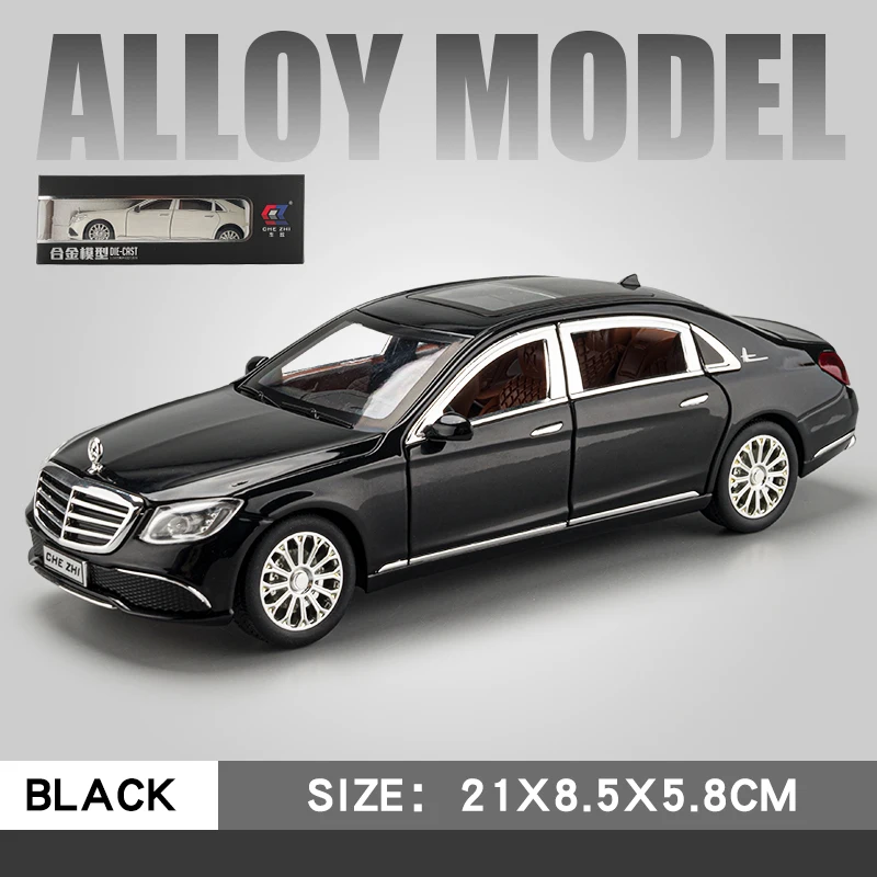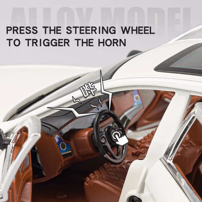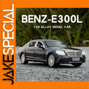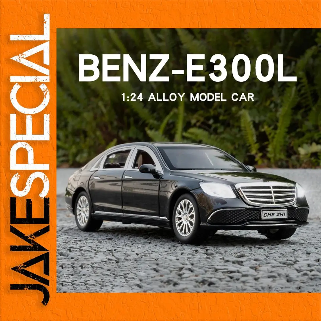 This 1:24 scale diecast model of a Mercedes Benz E300L E-class offers a sleek black or white finish, featuring realistic detailing such as functional doors, front wheels that turn left and right, shock absorbers on all four wheels, and pull-back motion. Equipped with sound and light functions, this collectible metal and ABS model captures the elegant sedan silhouette, including a prominent front grille with chrome slats, clear headlights, detailed taillights, and multi-spoke alloy wheels. Perfect for display, collection, or gifting, it is certified under the 3C standard, designed for adult enthusiasts.