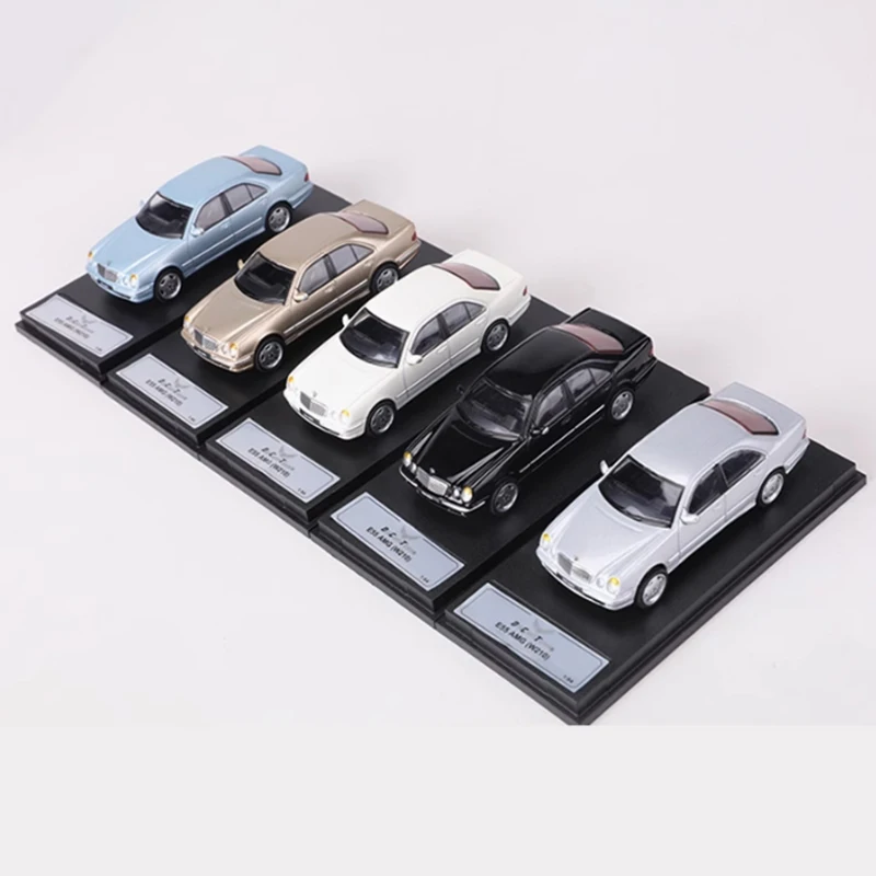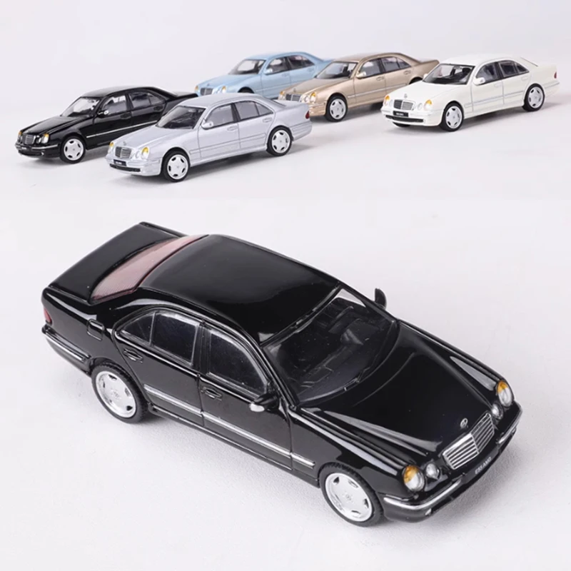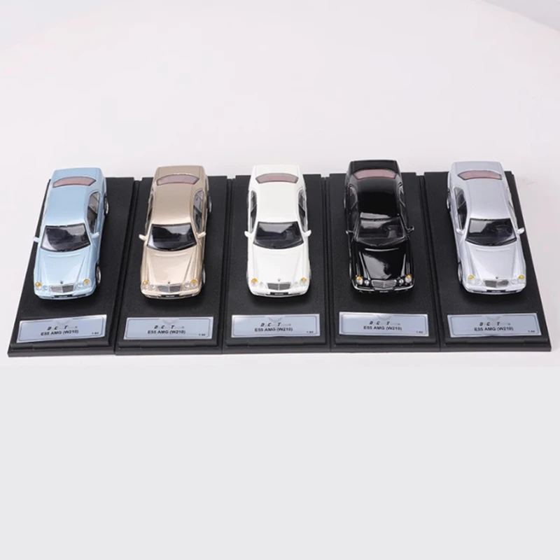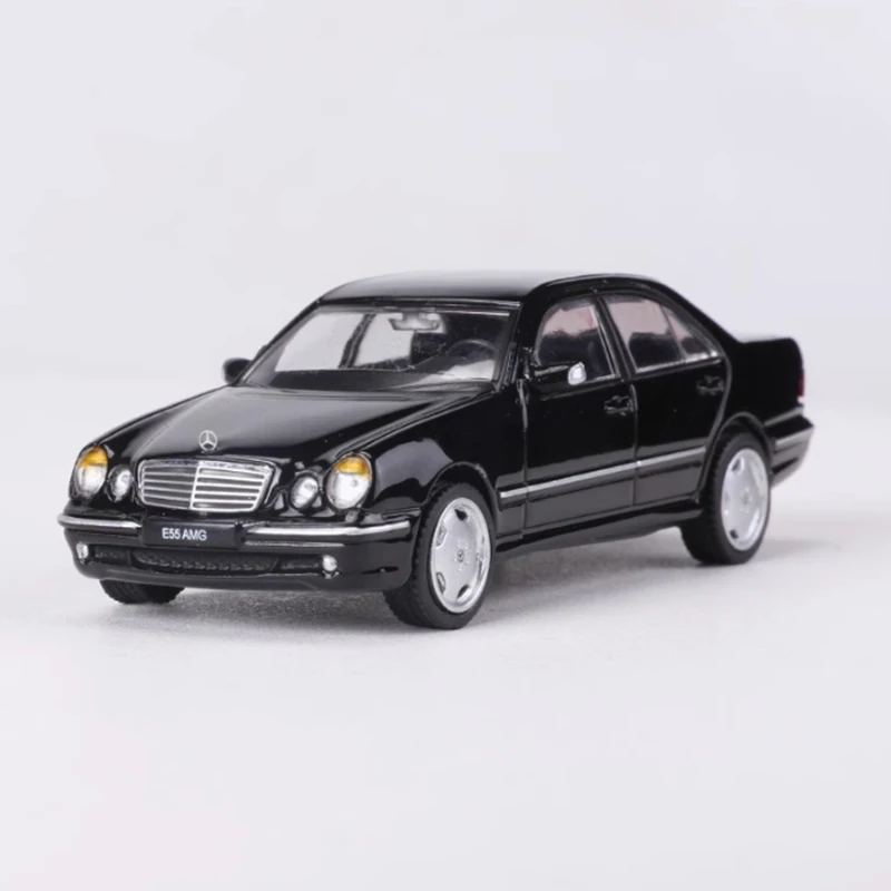 This highly detailed 1/64 scale diecast alloy model of the E55 AMG W210 Sedan features a sleek black finish, with an alloy body, fully enclosed design, and a simulated chassis that highlight exquisite craftsmanship. The compact, realistic proportions include a prominent front grille with round headlights—one subtly tinted yellow—clear transparent windows revealing a detailed interior, small proportionate side mirrors, and delicately molded door handles. Silver wheels with detailed rims and subtle tire tread patterns enhance its authentic appearance. Crafted from durable alloy and plastic materials, this collectible model is perfect for display, gifting, or adding a touch of sophistication to any collection or workspace.