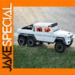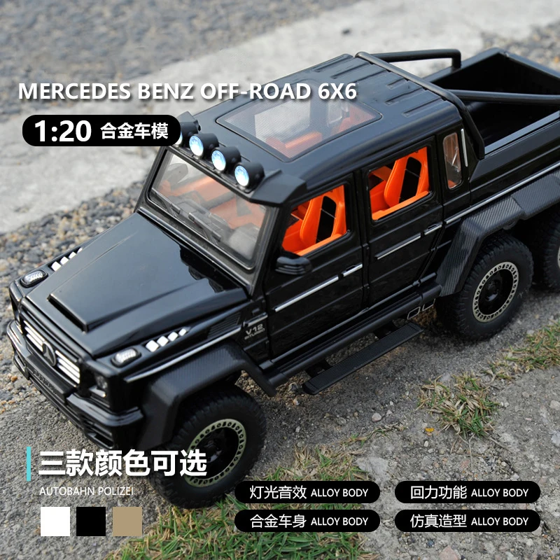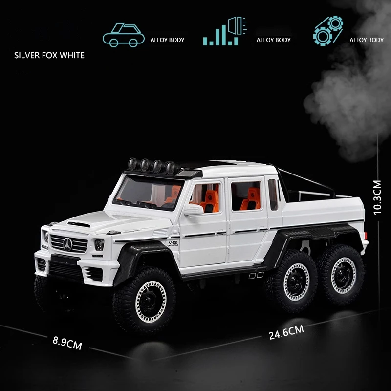 Immerse yourself in the rugged world of off-road adventures with this meticulously crafted 1:20 scale diecast model of the Mercedes-Benz G63 AMG 6X6. Made from durable alloy and plastic, it captures every detail from the angular, boxy body to the large, textured off-road tires with prominent treads. The striking white exterior is accented with black rims, side rails, and a roof-mounted light bar, giving it an aggressive yet sophisticated look. The transparent side windows reveal vibrant orange seats inside, adding a splash of color behind the detailed grille and bumper. With sound and light features enhancing realism, this model is perfect for collectors and enthusiasts alike, bringing the spirit of off-road exploration into your space.