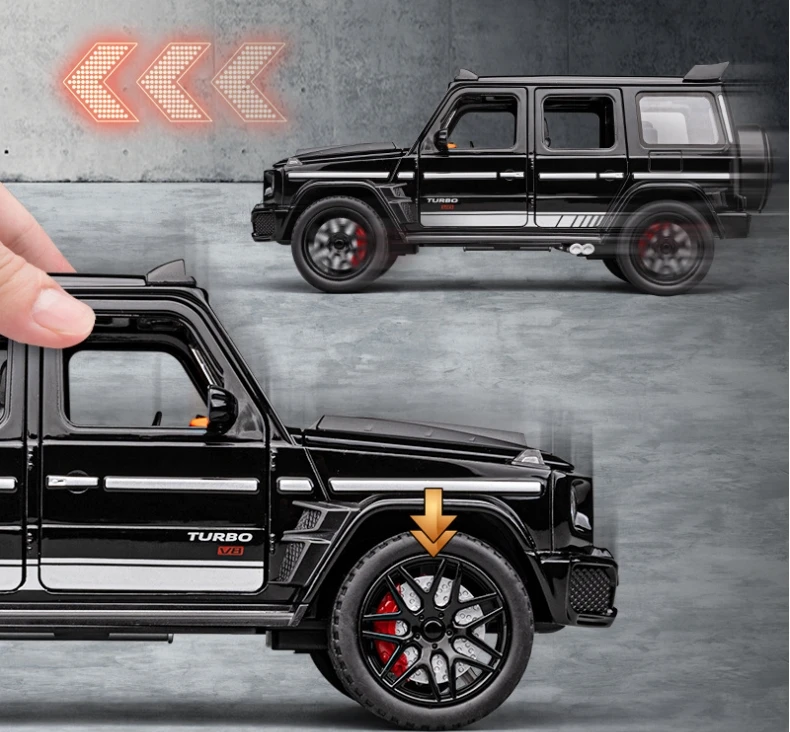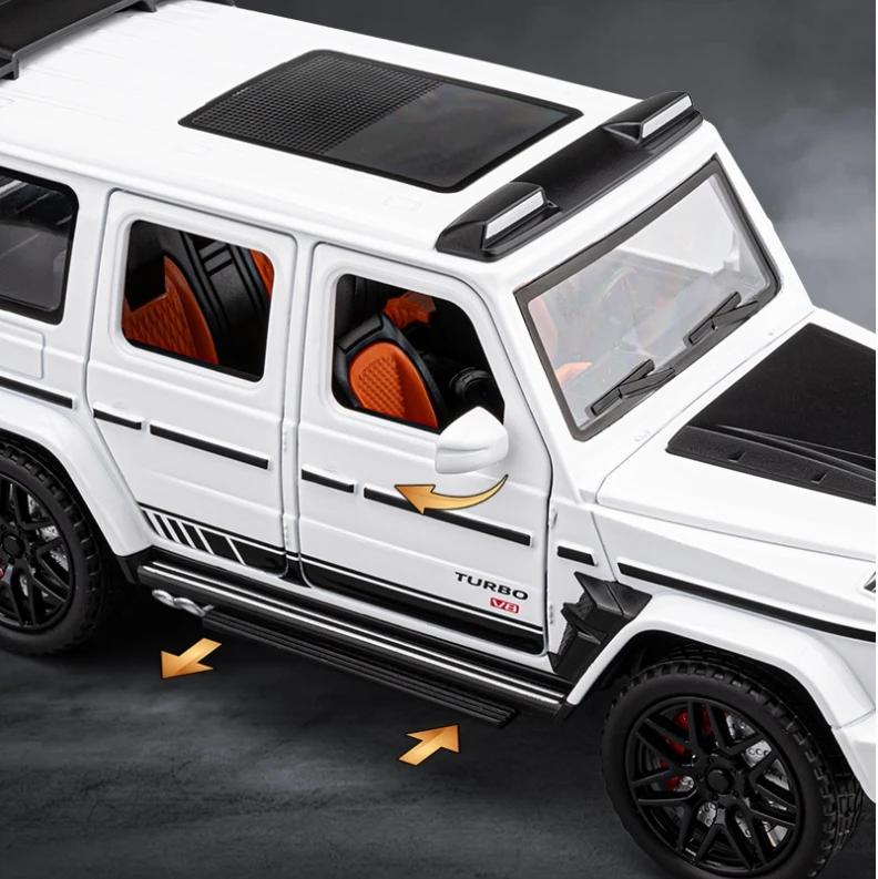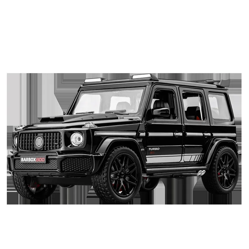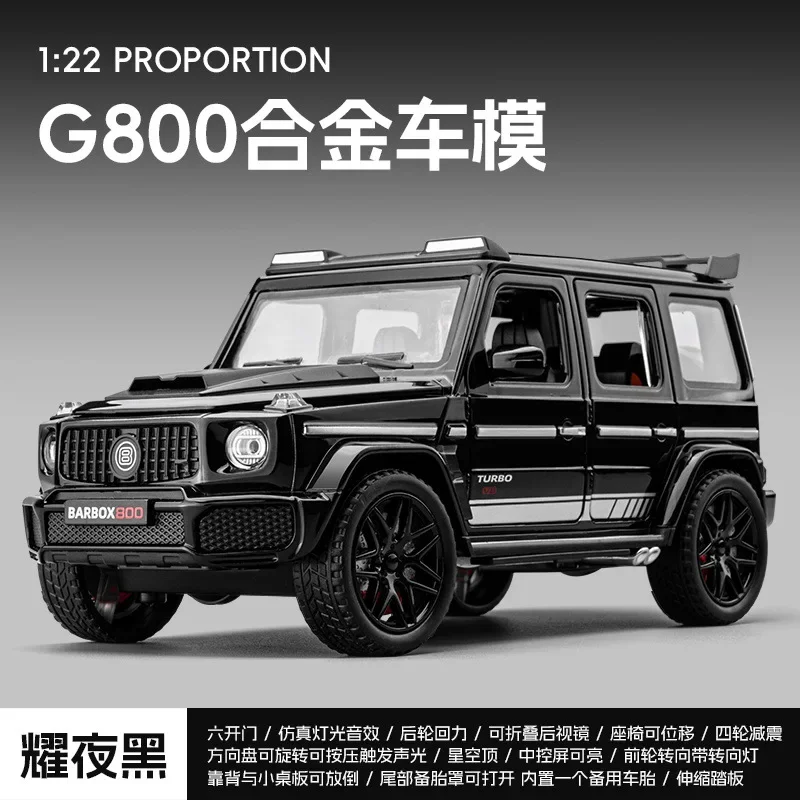 Step into the world of luxury and precision with this detailed 1:22 scale diecast model of the Mercedes Benz G800. Crafted from high-quality metal, this collectible captures the iconic boxy SUV silhouette with sharp, clean lines and sculpted surfaces that embody strength and elegance. Its sleek black finish exudes sophistication, while the prominent front grille with a dark, grid-like pattern features the elegant Mercedes Benz emblem at the center. The model's realistic headlights glow with a bluish tint, and the detailed hood showcases an air vent and contoured lines for a bold look. Side mirrors, tinted side windows, multi-spoke black rims, and textured tires with tread patterns enhance its authenticity. Perfect for display, it blends realism with style for any enthusiast’s collection.