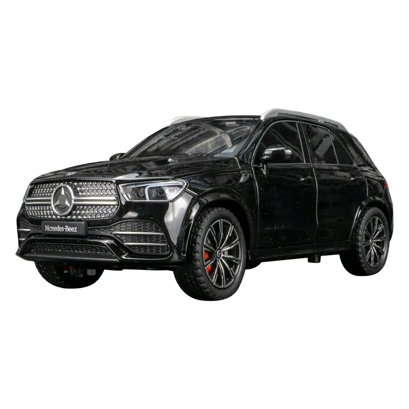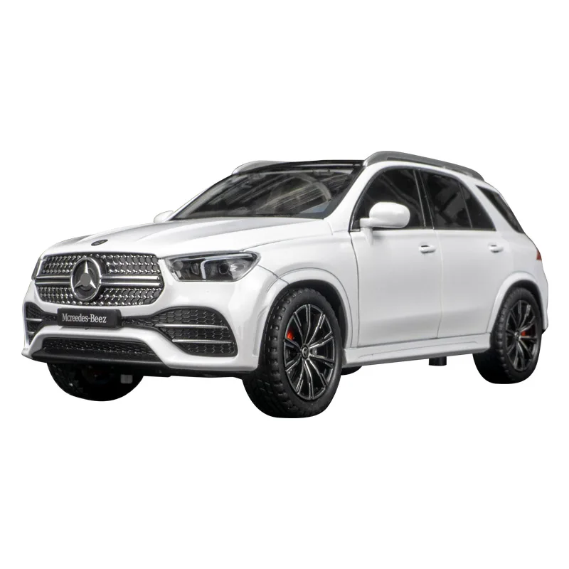 This 1:24 scale Mercedes Benz GLE350 diecast model features a sleek white finish with a contrasting black roof, detailed chrome-trimmed front grille with the Mercedes-Benz logo, sharp modern headlights, sculpted hood lines, and multi-spoke alloy rims. Equipped with opening doors, it combines realistic craftsmanship with stylish design, making it perfect as a children’s toy or an elegant off-road vehicle ornament. Crafted from durable metal and powered by button batteries, it is available in black, blue, and white. CE certified with certificate number NAP24080849C01E, this highly detailed model appeals to collectors and enthusiasts aged 6 to 18 years, capturing the luxury and sophistication of the GLE350.